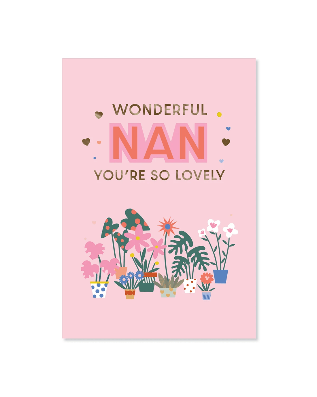• The front of the card features gold foil highlights, illustrations of colourful potted plants and the message 'WONDERFUL NAN YOU'RE SO LOVELY'