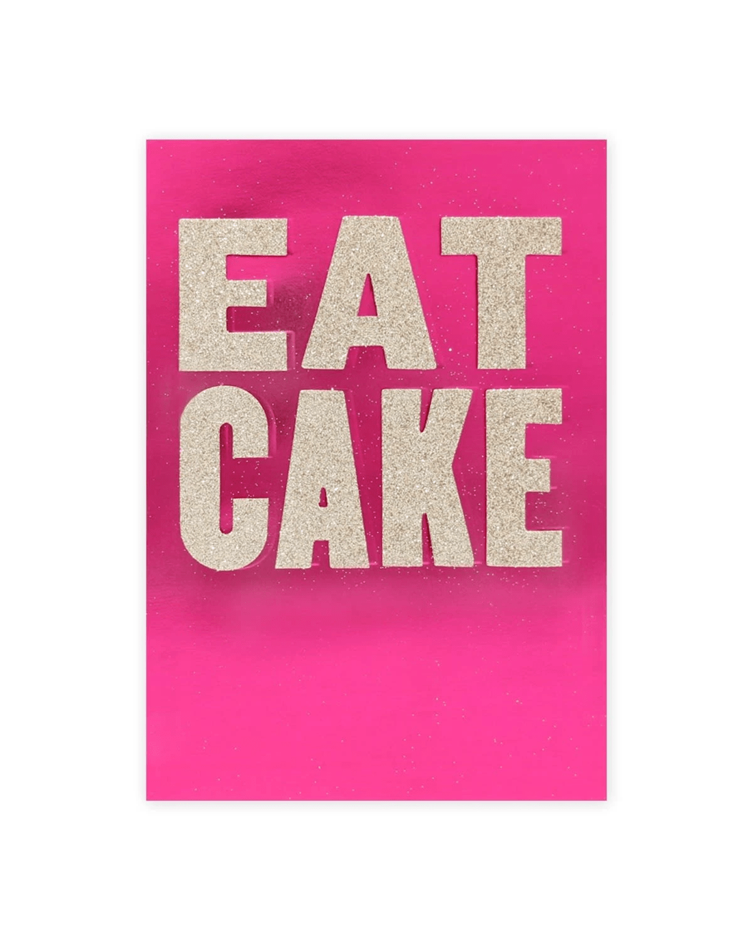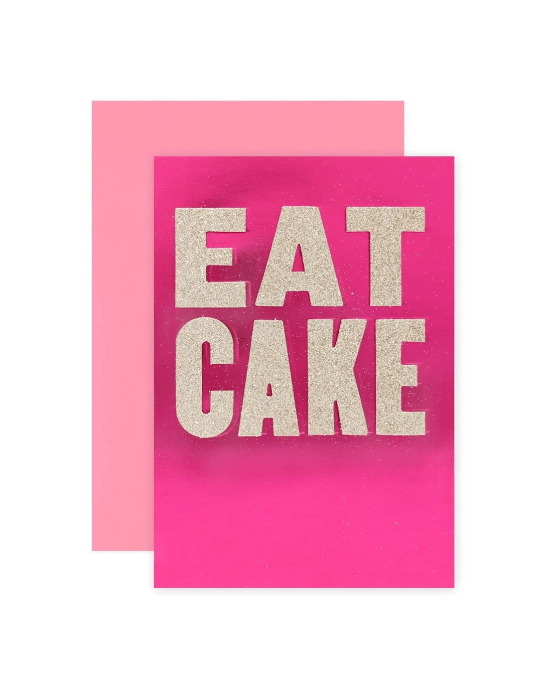 • The front of the birthday card features a bold laser cut glitter 'EAT CAKE' message on a metallic hot pink background