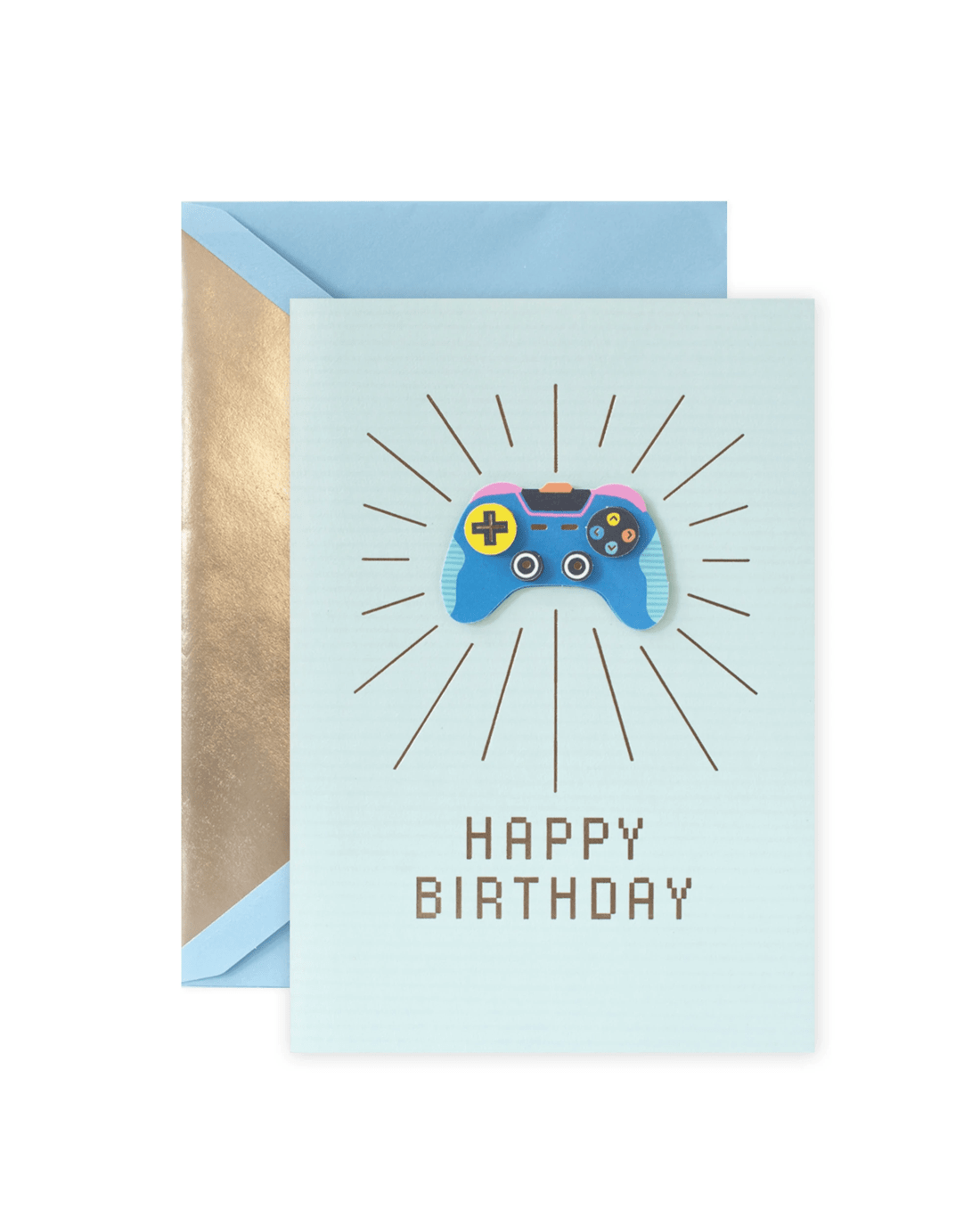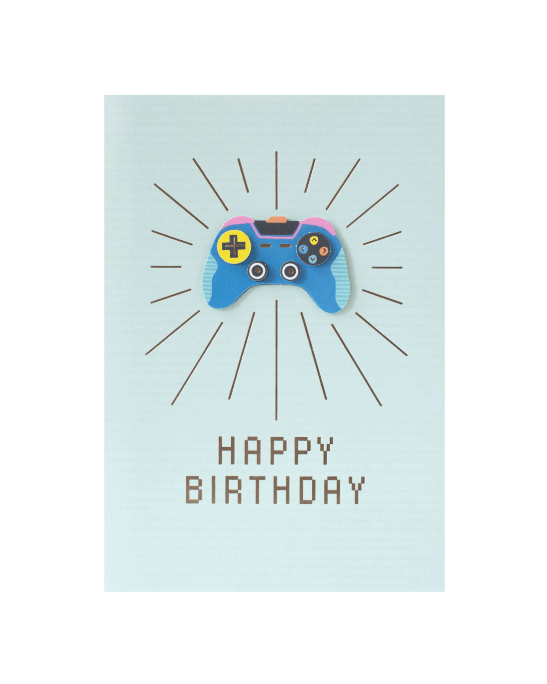 • The front of the card features bronze foil highlights, a 3D plaque attachment of an illustrated video game controller and the message 'HAPPY BIRTHDAY'
