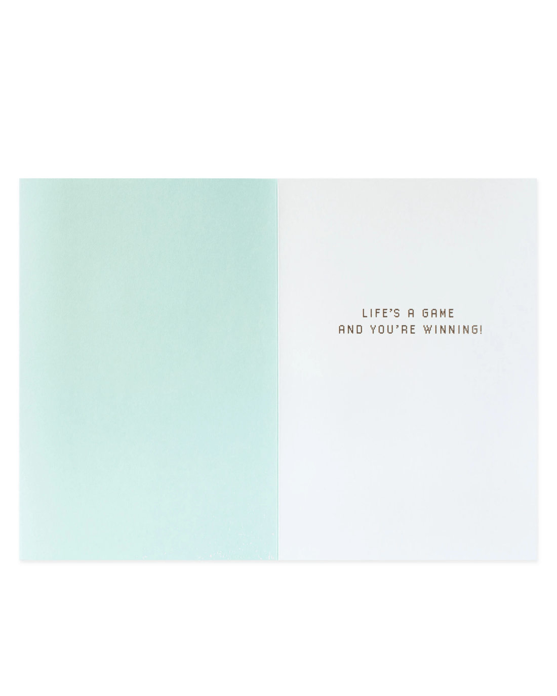 • The inside of the card features bronze foil highlights and the message 'LIFE’S A GAME AND YOU’RE WINNING!'