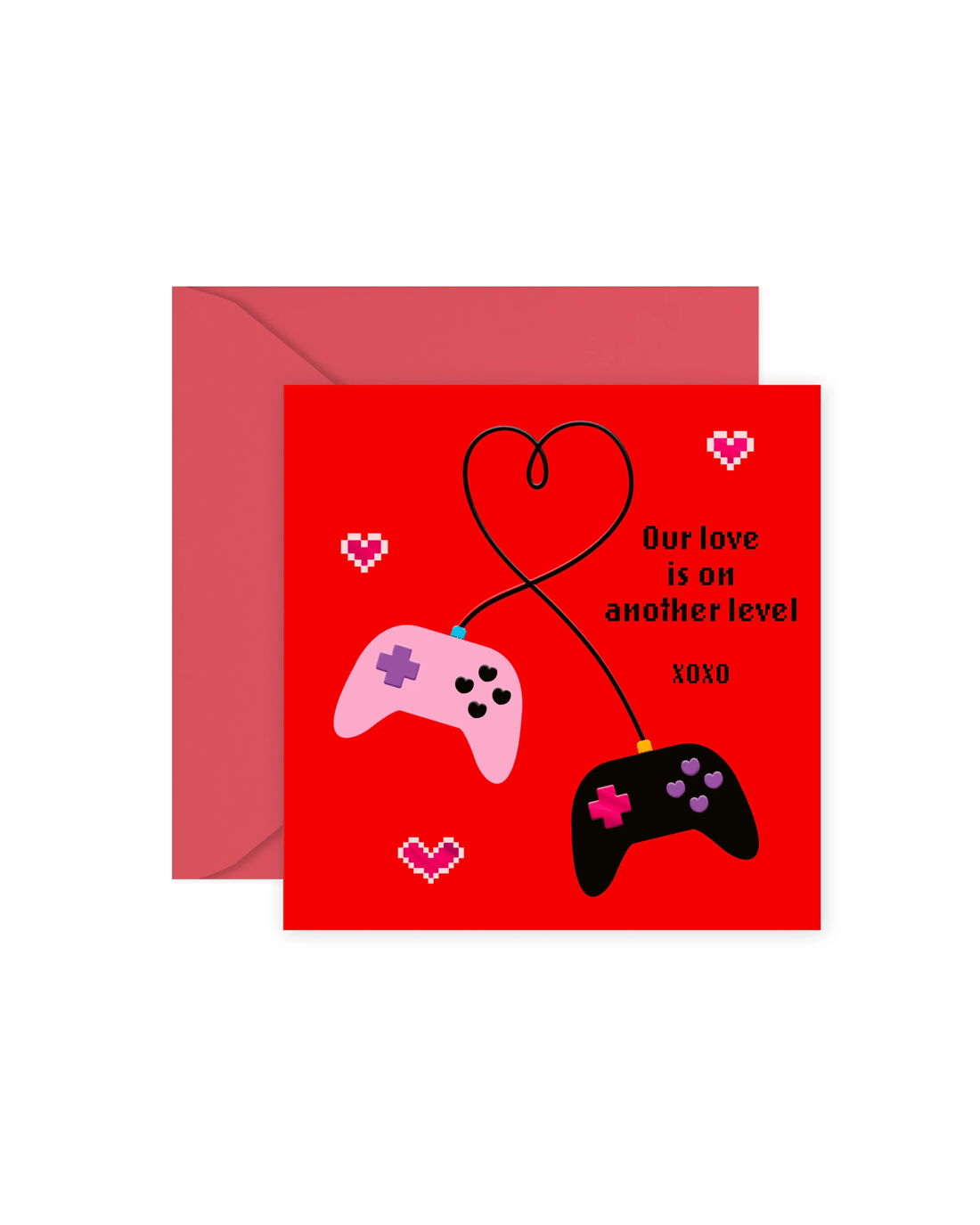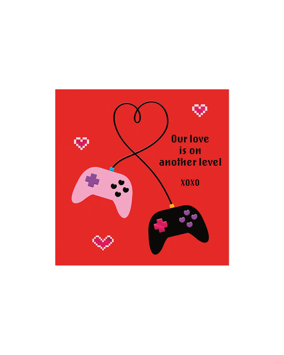 • The front of the card features pink foil highlights, embossed elements, illustrations of red and white pixel hearts alongside two handheld gaming controllers with the wires making a love heart and the message 'Our love is on another level xoxo'