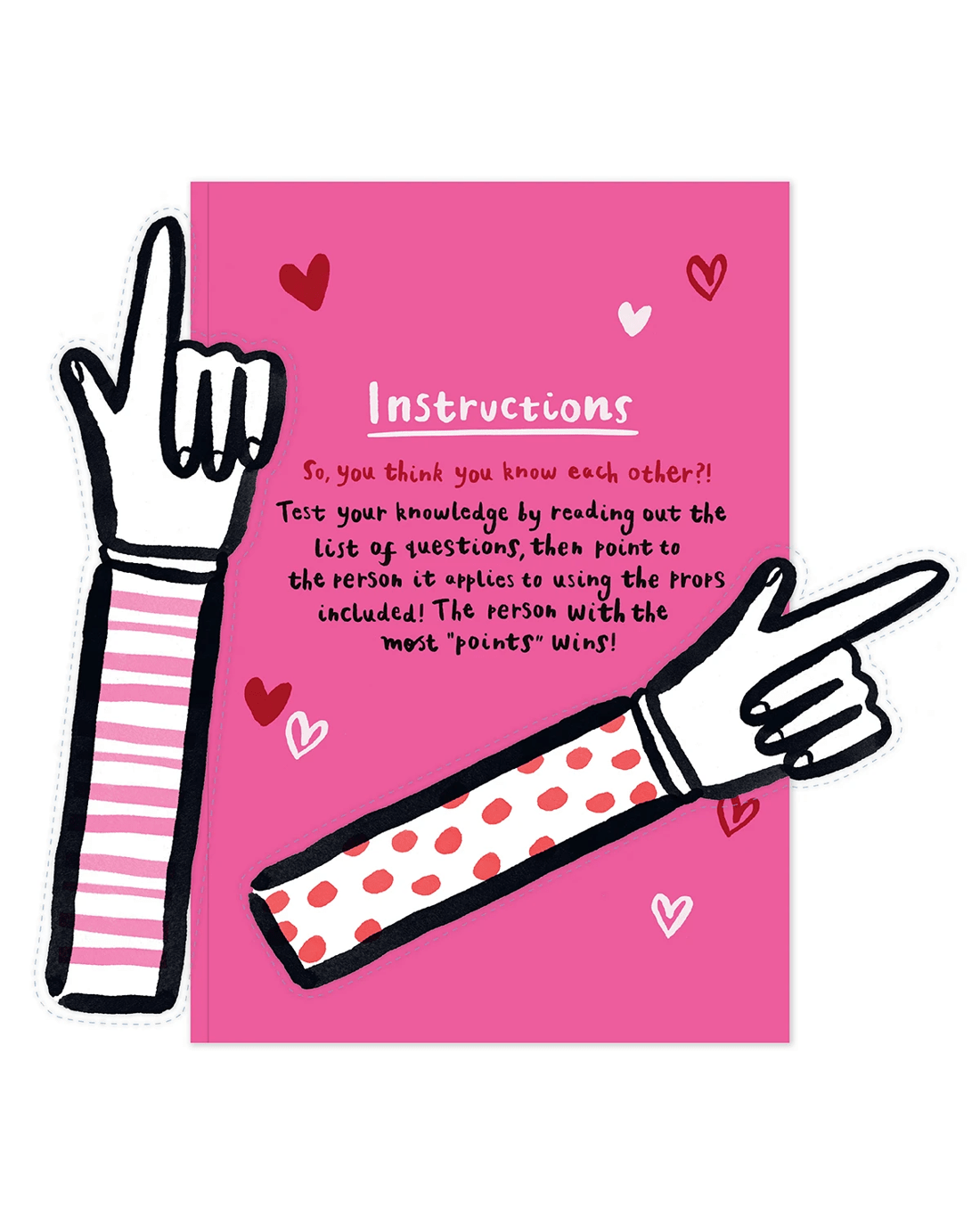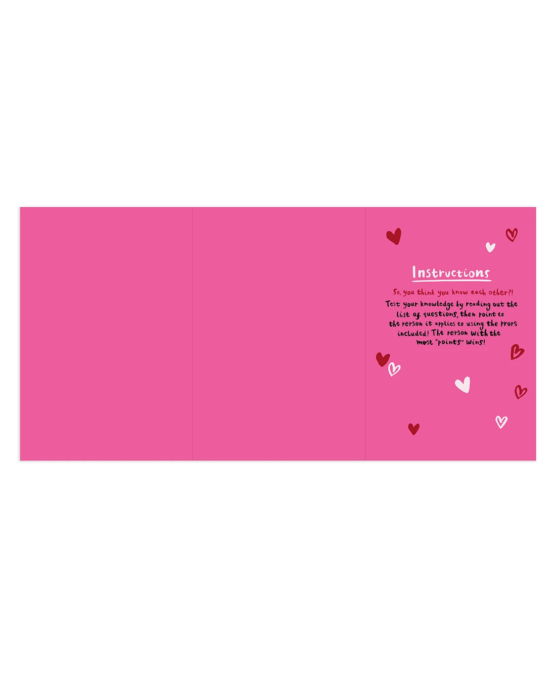 • The inside of the card features illustrations of love hearts alongside the message 'Instructions So, you think you know each other?! Test your knowledge by reading out the list of questions, then point to the person it applies to using the props included! The person with the most 'points' wins!'
