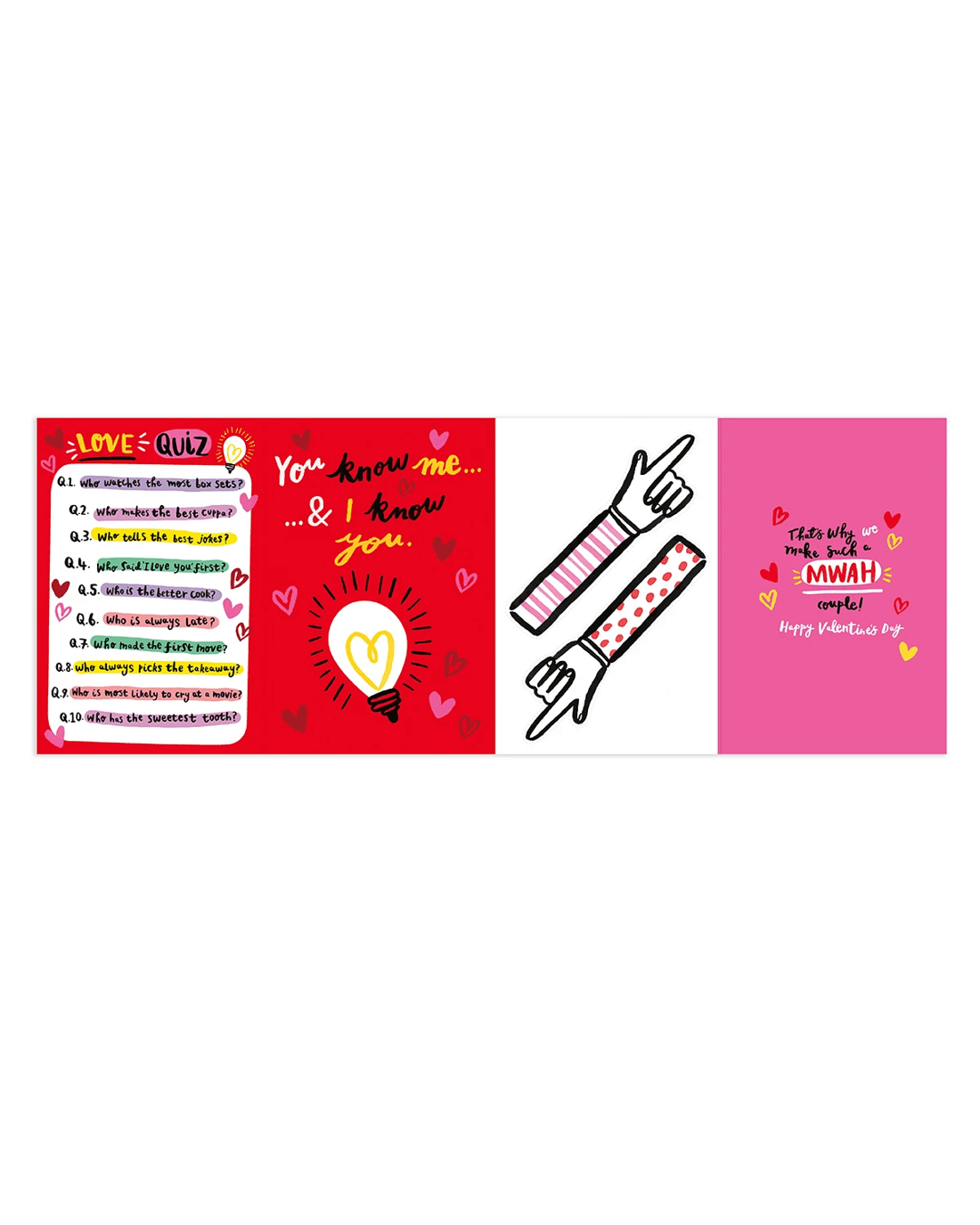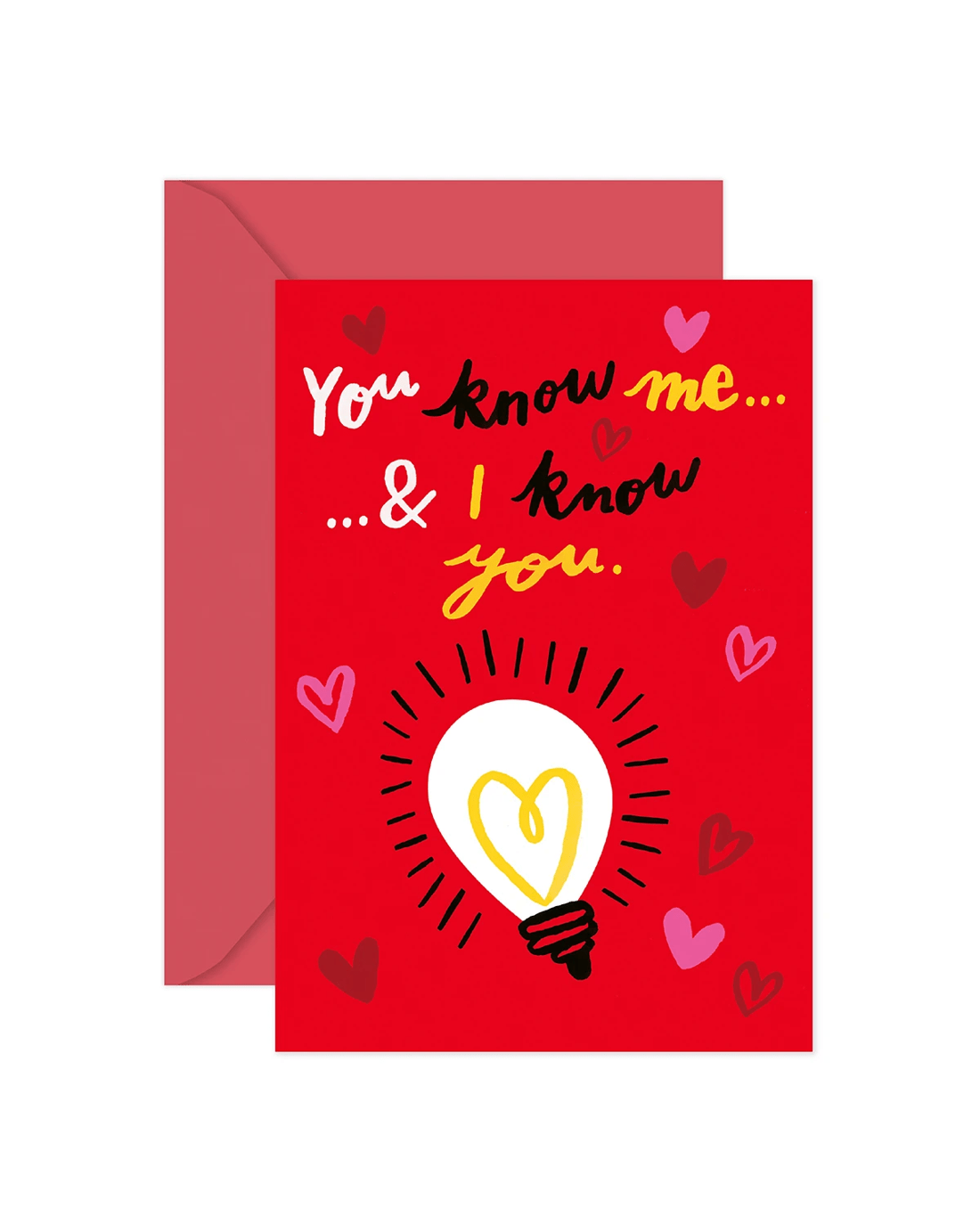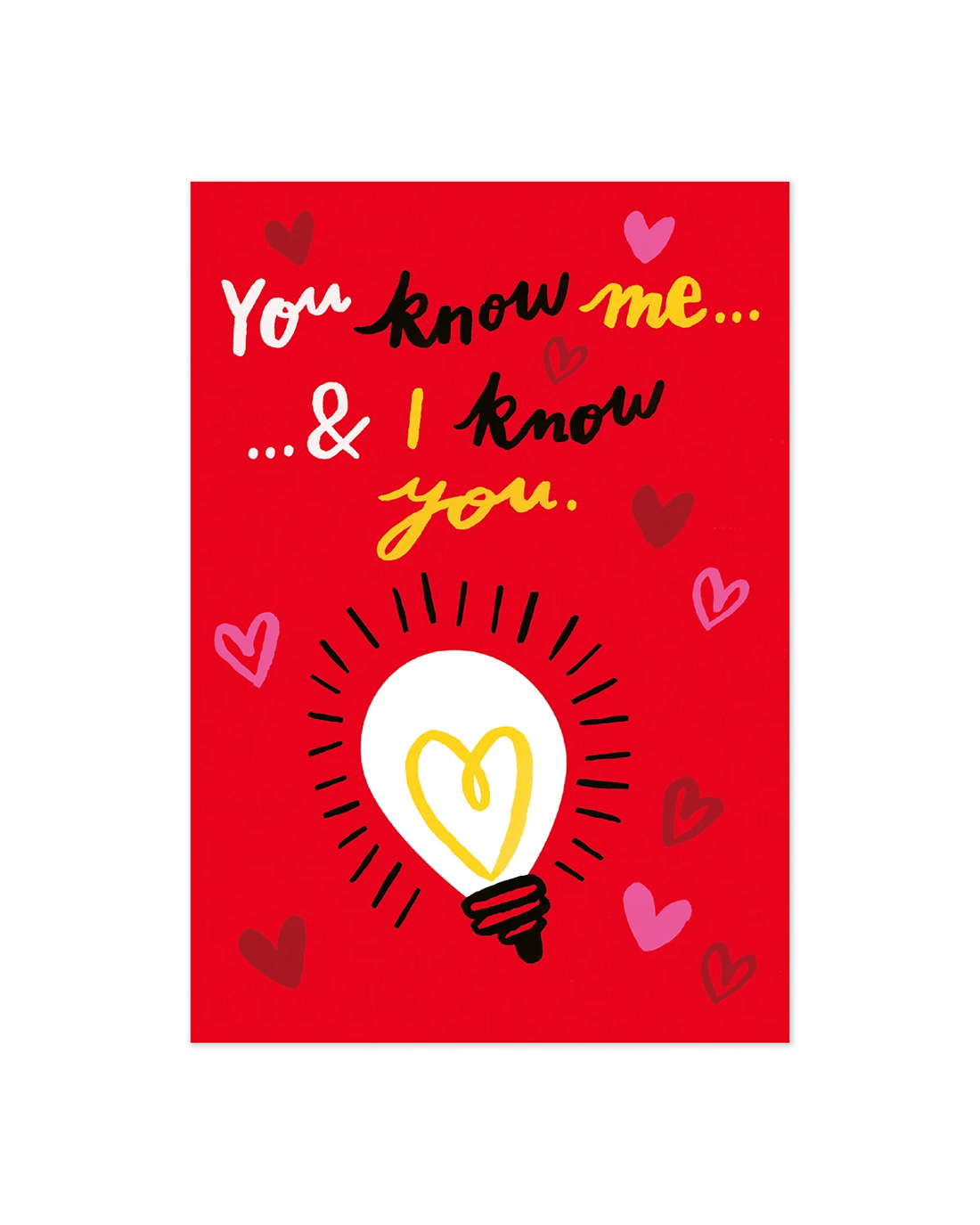 • The front of the card features illustrations of love hearts and a light globe alongside the message 'You know me... ...& I know you.'