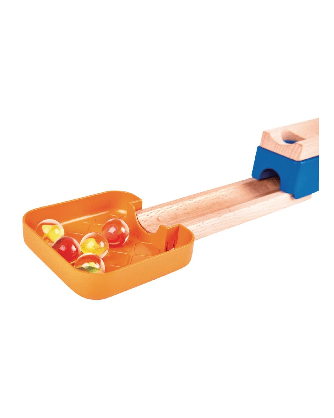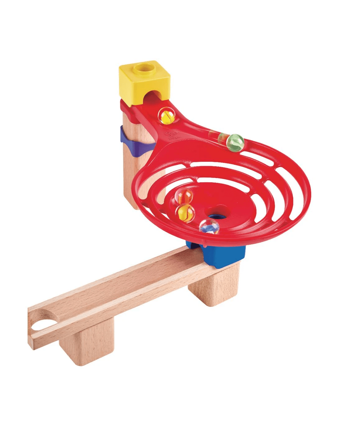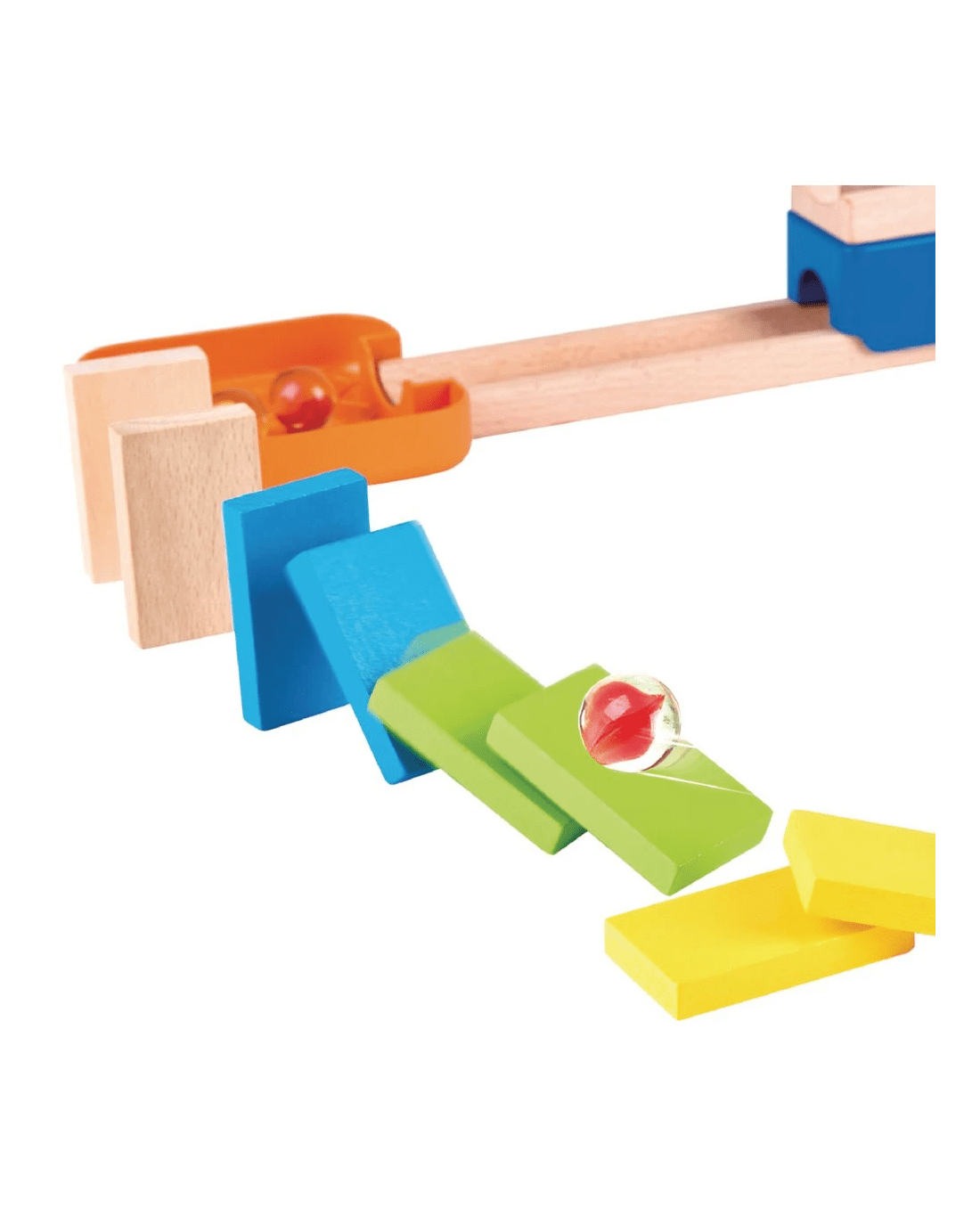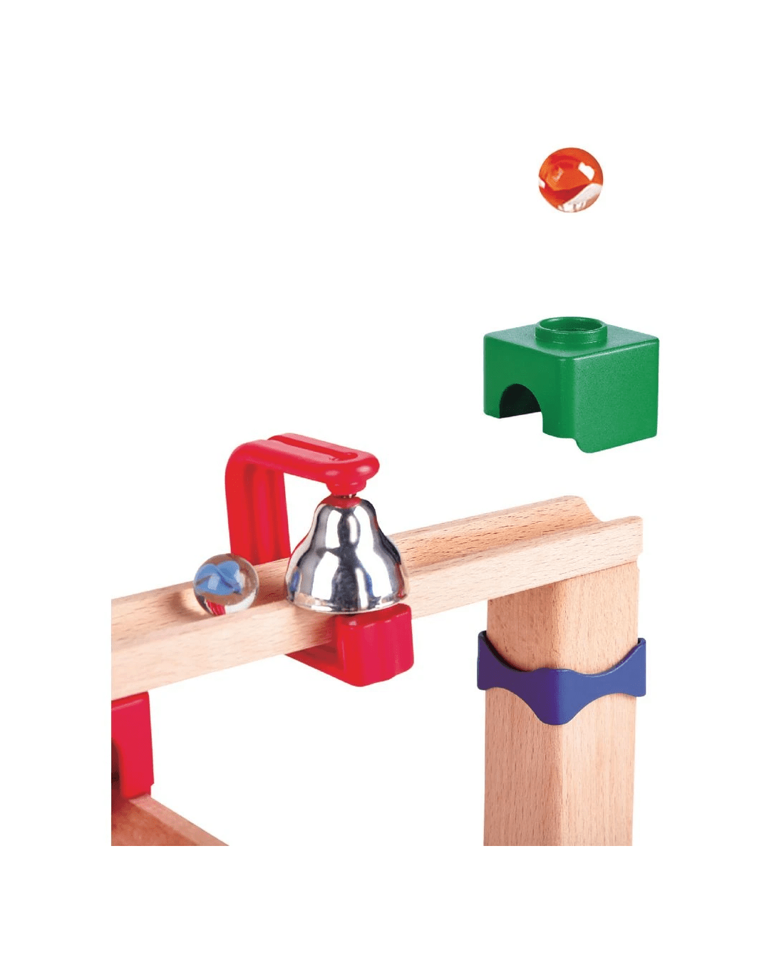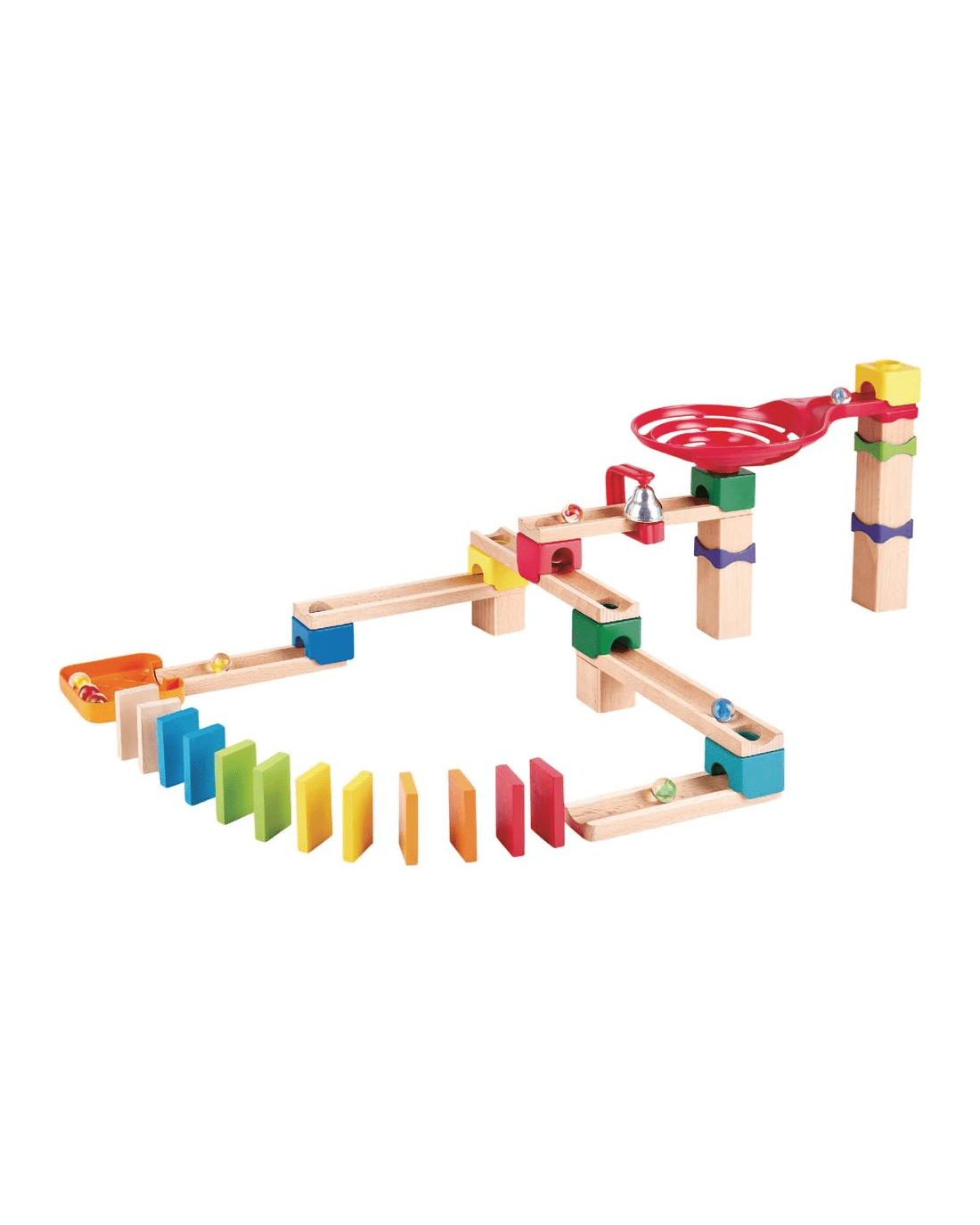 • The track includes a ringing bell, a spiral funnel, a marble tray and a set of 12 dominoes for your marbles to get through.