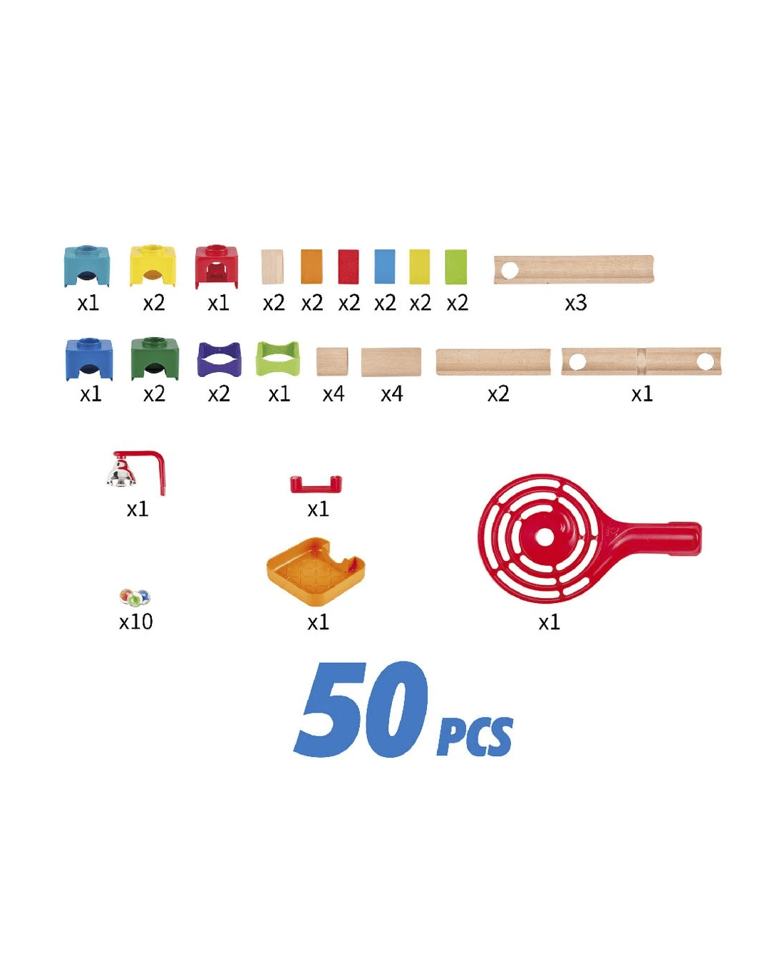 • There are 50 pieces in this set including blocks, tracks, marbles and everything you need to create the track.