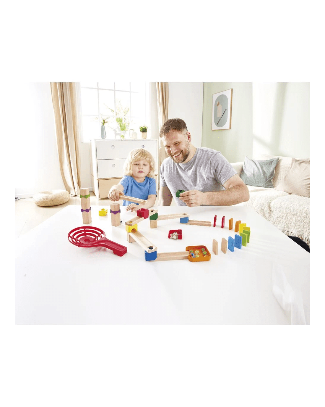 Design your very own marble track with this 50-piece DIY block set from Hape. Build towers and tracks then send your marbles rolling down through all the tricks, twists and surprises and see whether it lands in the tray or knocks over all the dominoes. This set is great for encouraging hand-eye coordination, planning and logical thinking.