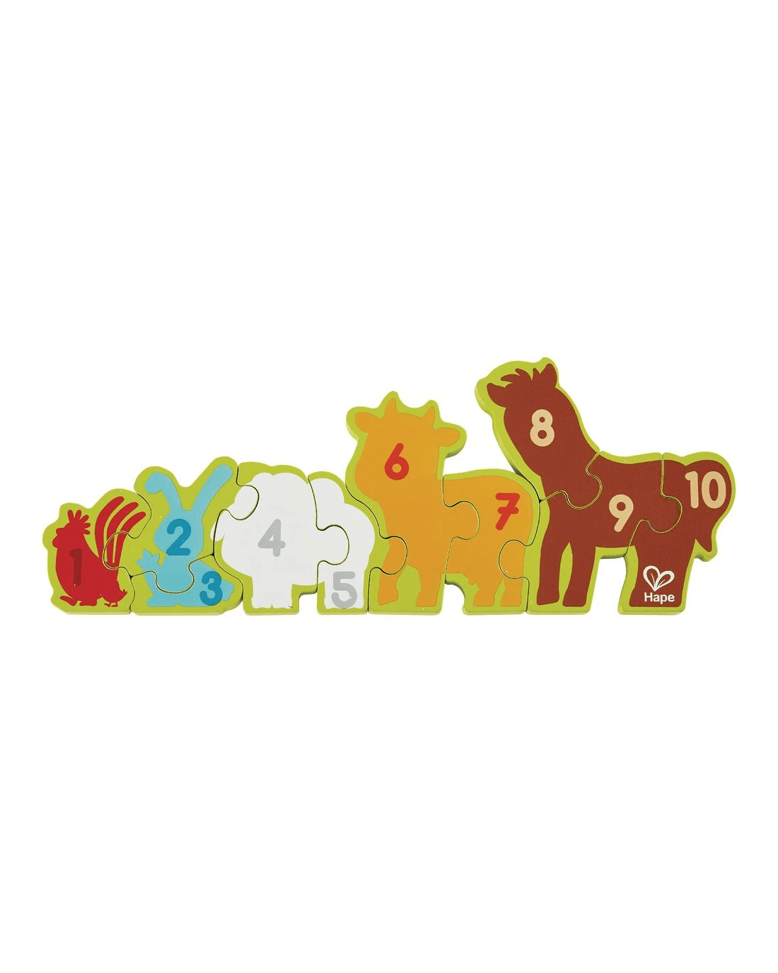 This Numbers and Farm Animals Puzzle is a great way to start learning about both animals and numeracy. It is a beautifully crafted 10-piece, wooden puzzle with farm animals on one side and the numbers 1 to 10 on the other. The wide base lets you stand the puzzle upright on the table or windowsill.