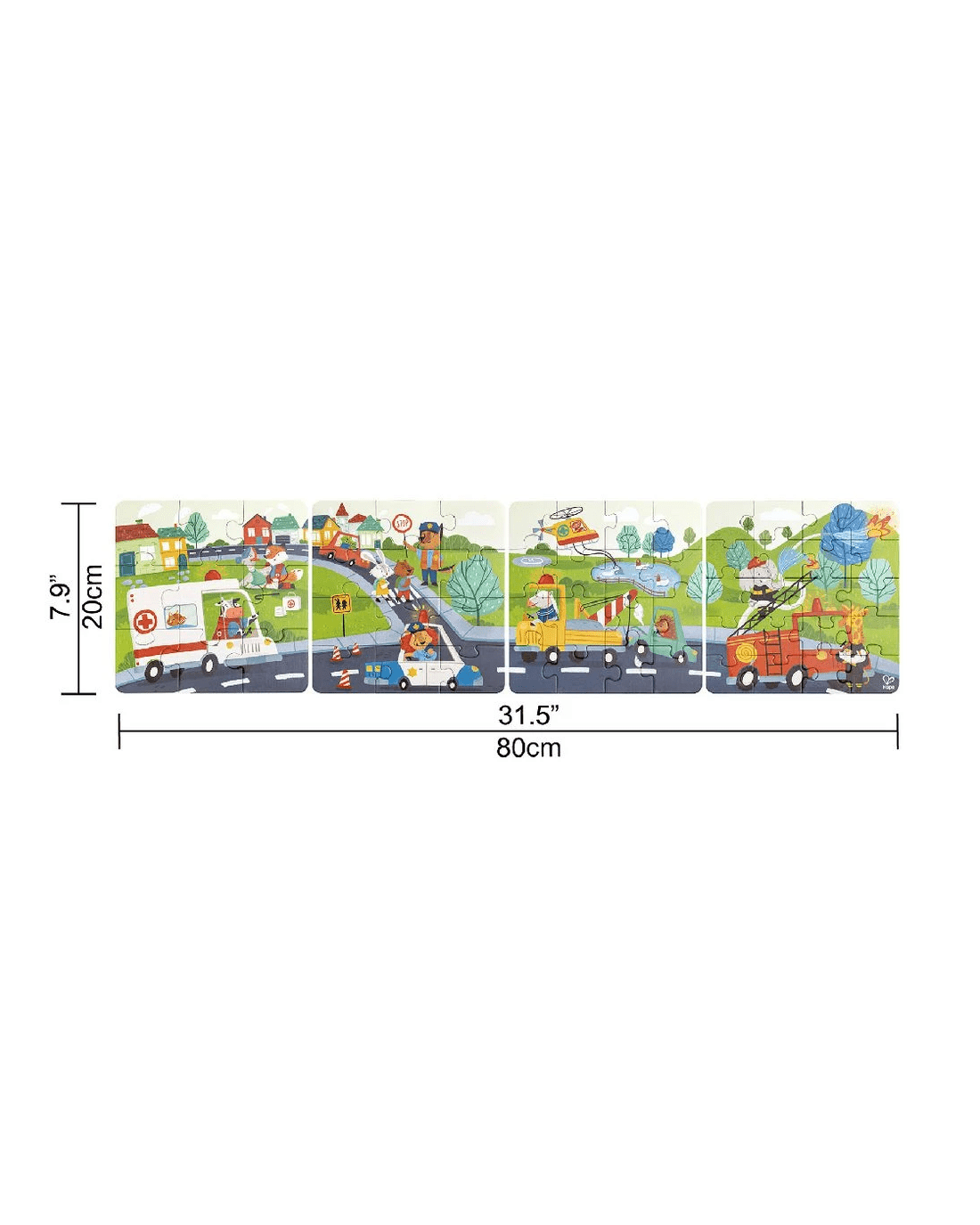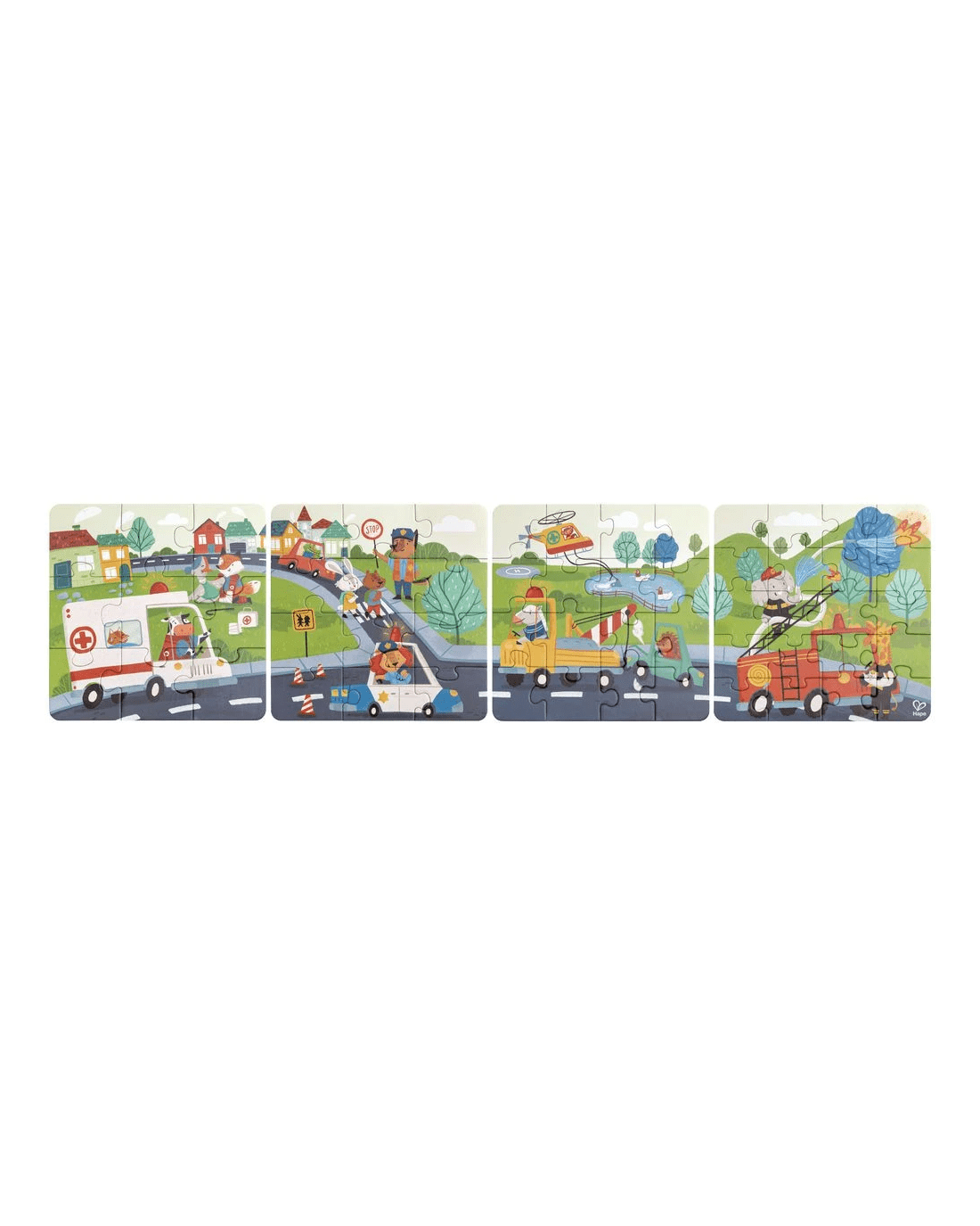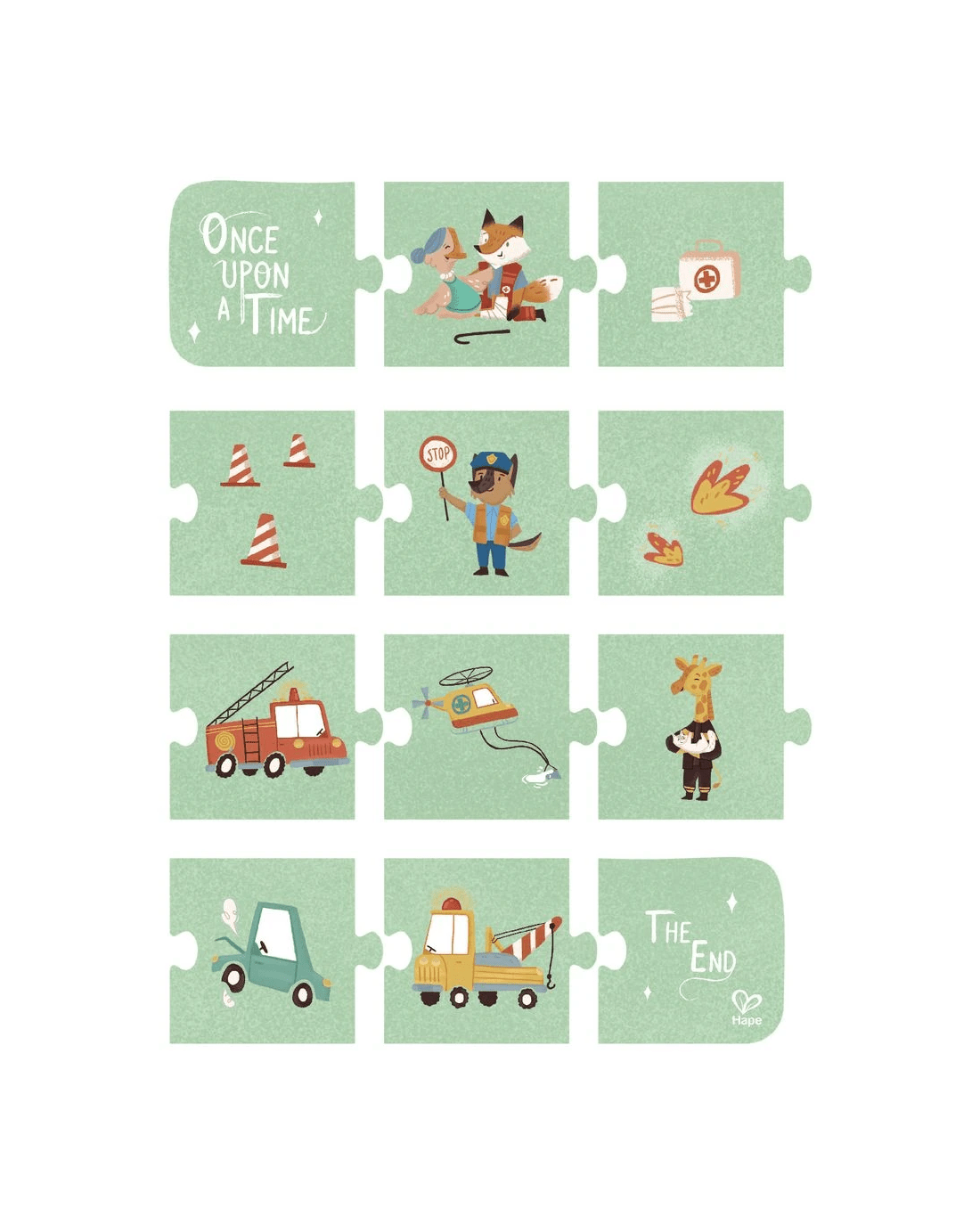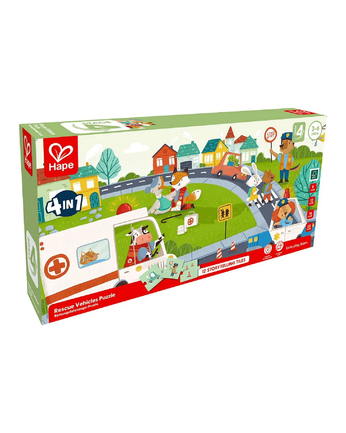 This Hape Rescue Vehicles Puzzle Set is made up of 4 separate puzzles of different sizes so you can progress your puzzle abilities. As you piece together your very own road rescue story with the puzzles, there are also additional storytelling tiles for endless story creations based on the puzzle`s topic.