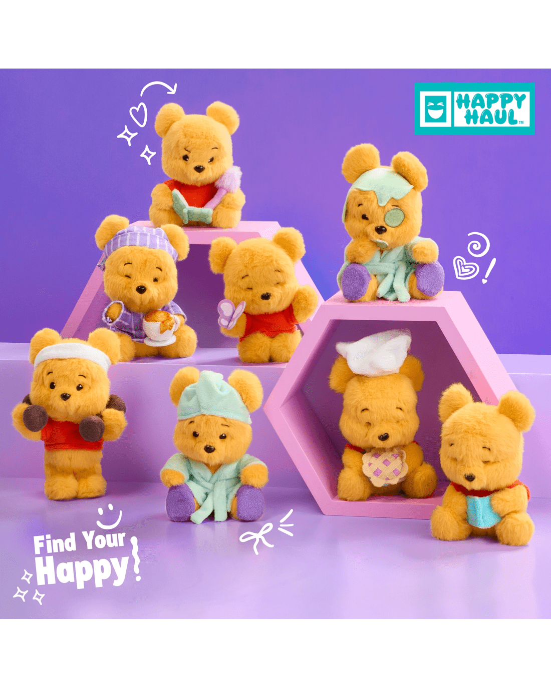- COLLECT HAPPINESS: HAPPY HAUL Disney Winnie the Pooh Hunny Hugs Capsule Plush toys gives the look of this beloved character a playful twist, with cozy themes inspired by relaxing moments.