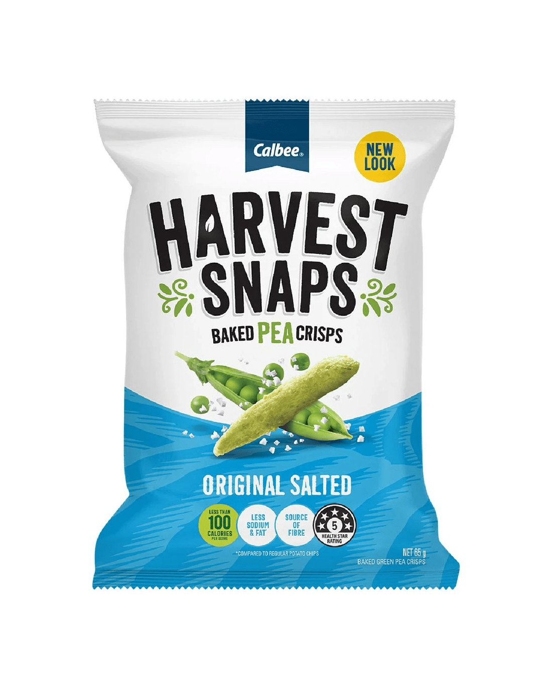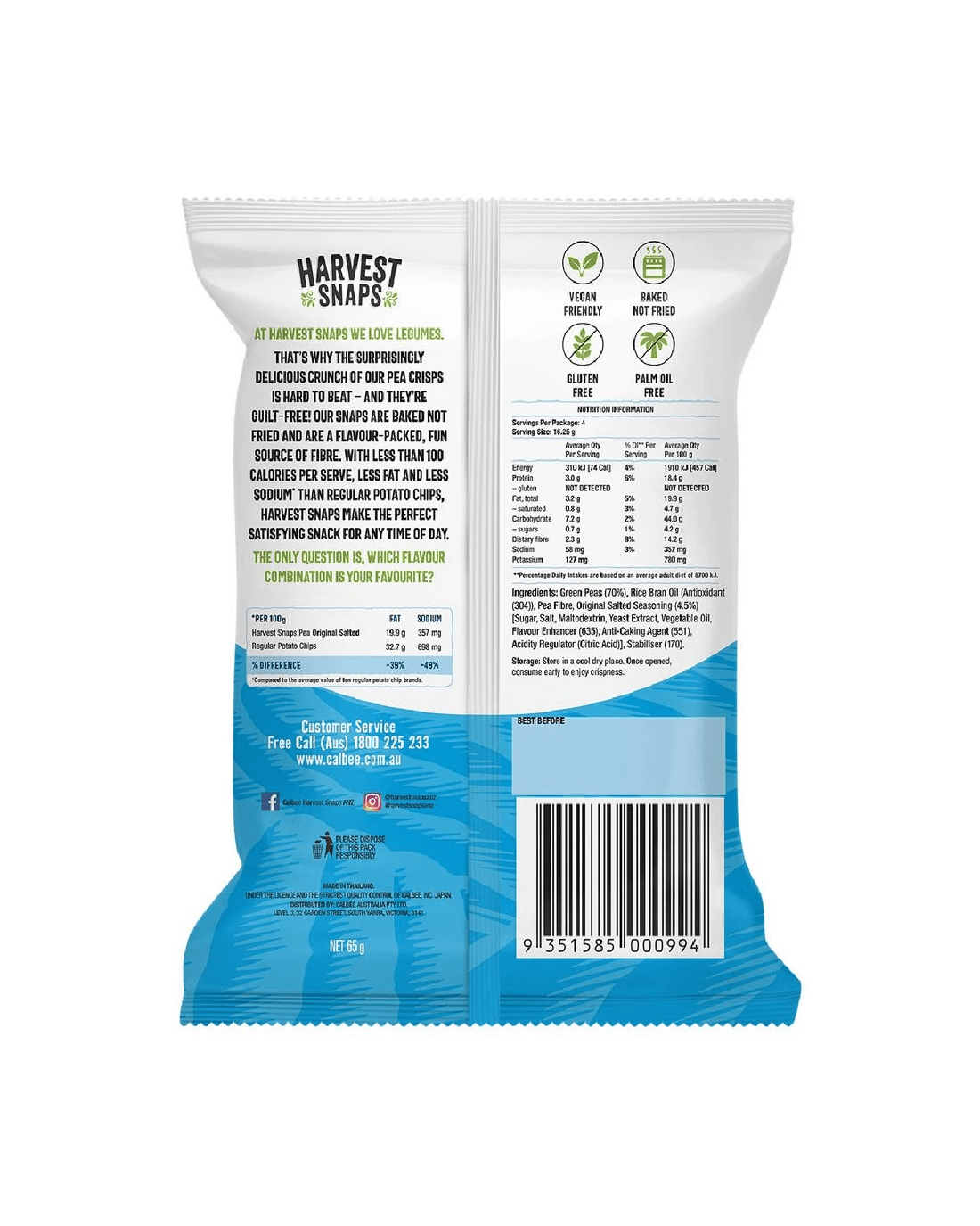 Experience the delicious crunch of pea crisps with these guilt-free Harvest Snaps. With less than 100 calories per serve and less fat and sodium than regular potato chips, Harvest Snaps make a satisfying snack at any time of the day. These original salted flavoured pea crisps are baked, not fried and are a fun source of fibre.