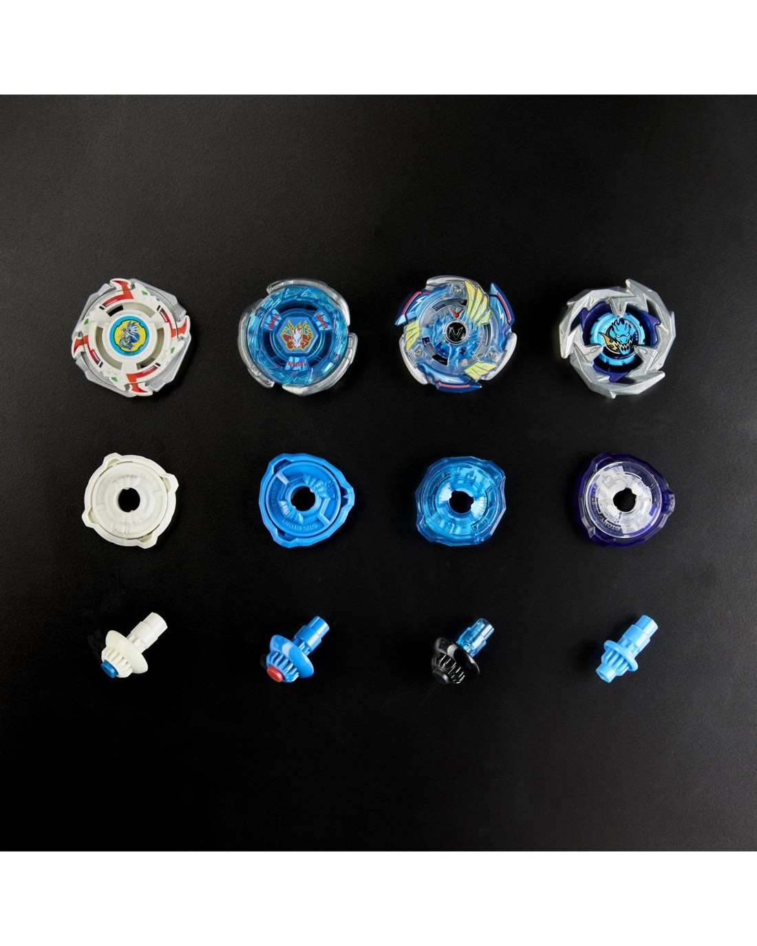 - INCLUDES 4 TAKARA TOMY-DESIGNED BEYBLADE X TOPS & 4 LAUNCHERS: Interchangeable blade, ratchet, and bit layers of Beyblade X tops assemble and reassemble with a quick twist and 2 clicks. The tops have authentic interchangeable die-cast metal parts