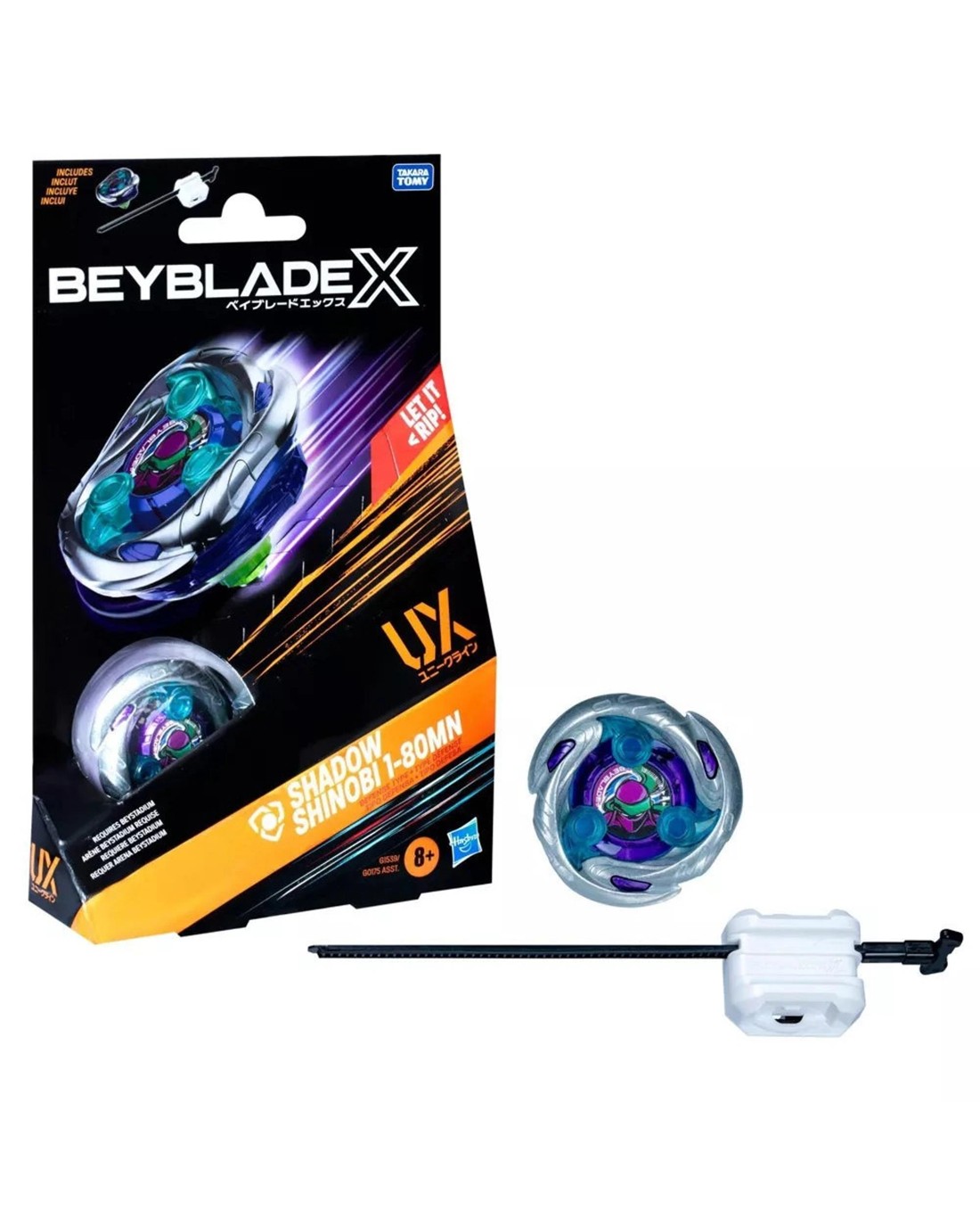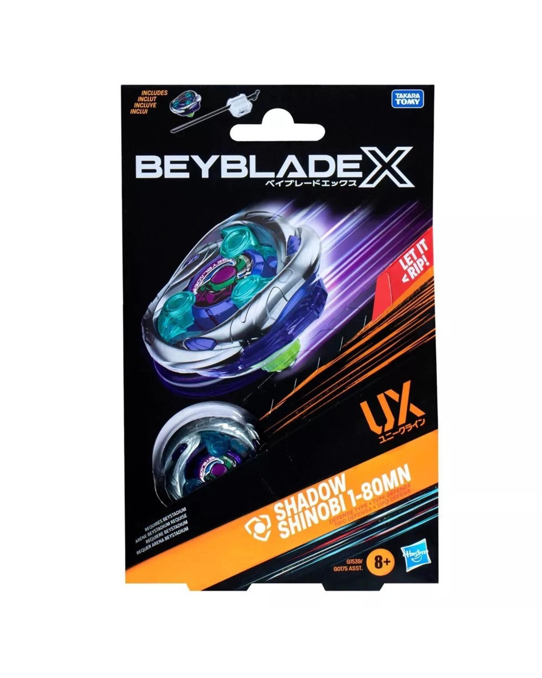 Experience the thrill of the next generation of Beyblade stadiums, launchers and tops: Beyblade X with the Beyblade X Shadow Shinobi 1-80MN UX Starter Pack Set (Beystadium required, sold separately). Launch right into battle or reconfigure the interchangeable blade, ratchet, and bit of this Starter Pack with those of other Beyblade X tops (sold separately) to create your own unsurpassable Bey. Beyblade X features the X-Celerator Gear System innovation to level-up your game. When the gear of a Beyblade X top engages the rail of the Beystadium arena, it can super-accelerate into an Xtreme Dash rocketing it around the stadium for crushing collisions and epic bursts. Bladers launch their tops into fierce clashes against their opponent's scoring points with each confrontation - first to score 4 points wins. Ages 8 +