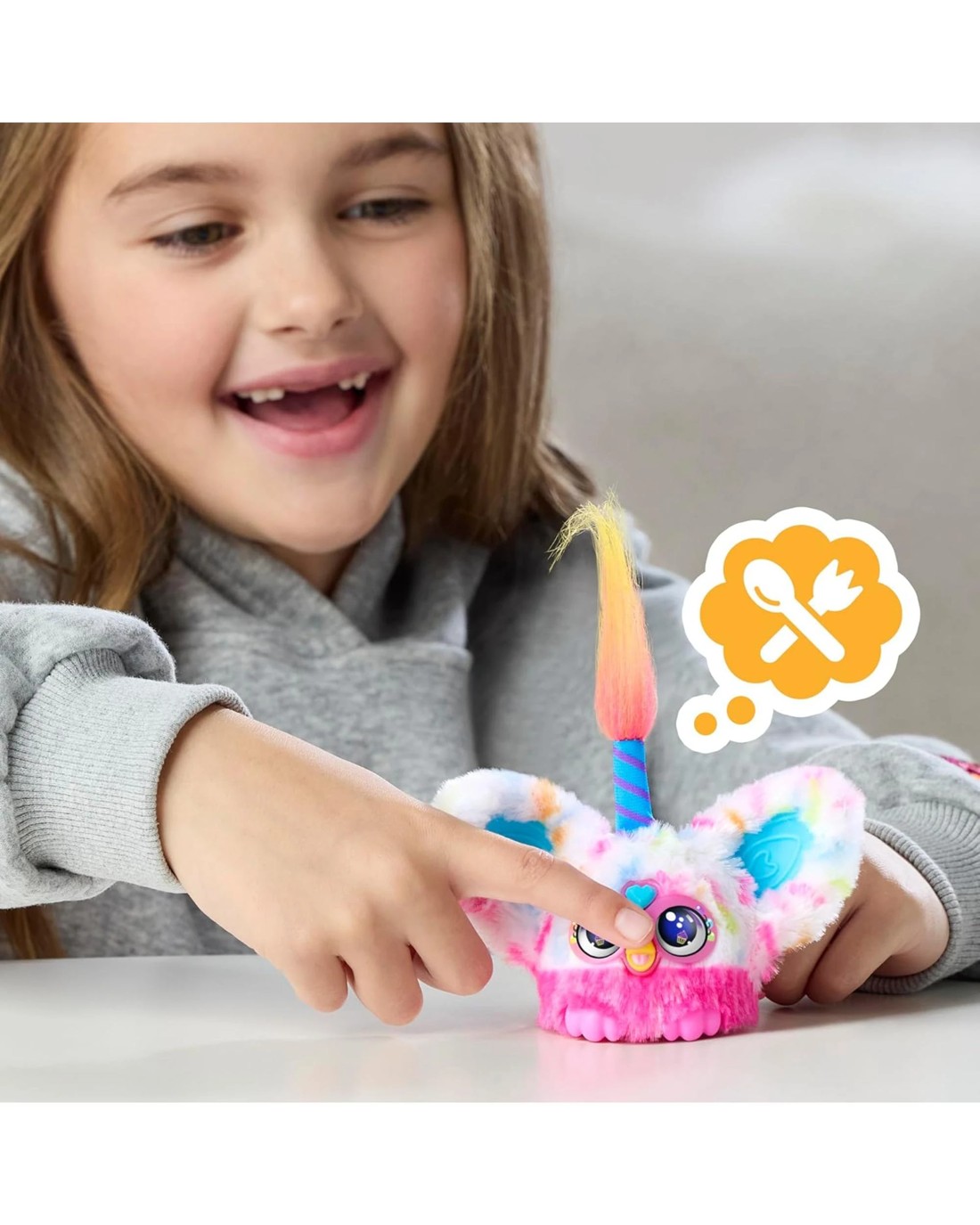 Make a wish and celebrate with Bee-Day the birthday Furblets friend! This mini Furby interactive toy looks like a tiny cupcake for a party any time. Explore a variety of over 45 fun sound effects and music by pressing the head, mouth, and heart gem on this talking toy. They even sing "Happy Birthday" in its own the unique language called Furbish (they don't speak human languages). Clip Bee-Day to a backpack or other travel bag with the keychain clip for awesome adventures anywhere you go. Make birthday party gifts for girls and boys a little more special with this festive friend! Furby and all related properties are trademarks of Hasbro. Ages 6 +