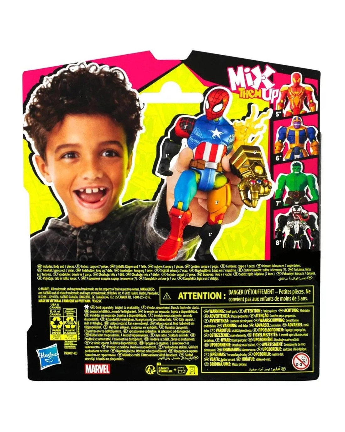 MADE TO MASH: Kids call the shots with Marvel Super Hero action figures they can pull apart, mix up, and mash together in wacky, customized waysMILLIONS OF MIXES: With millions of creative ways to mix the interchangeable parts, these Marvel toys for boys & girls encourage hours of imaginative play creating unique figuresINCLUDES MILES MORALES PART: Marvel Spider-Man action figure comes with a yellow Miles Morales bioelectric FX part, as well as additional hand and web accessoriesHEY, I KNOW THAT GUY: MixMashers Marvel toys feature only the most iconic heroes and villains, including Iron Man, Hulk, Thanos, Spider-Man, Miles Morales, Venom, Iron Spider, Black Panther, and Captain AmericaMULTIPLE MASHES: Designed for kids, toy MixMashers figures feature durable universal connectors for repeated mixing and mashing, time and time againTHAT'S SO MASHED-UP: Build out a zany, mashed-together multiverse of favorite characters and fun accessories with MixMashers toysCOOL MARVEL PRESENTS: MixMashers action figures make great gifts for boys & girls, ages 4 and up (Each sold separately. Subject to availability.)Contents
