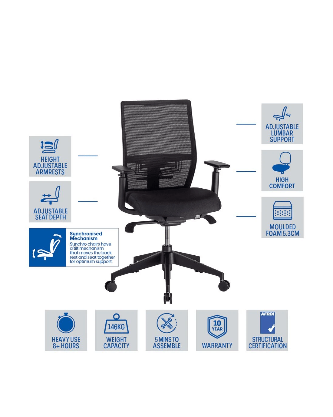 - The chair is AFRDI Blue Tick Level 6 certified meaning it has been tested to AS/NZS 4438 standards and is suitable for heavy commercial use conditions.