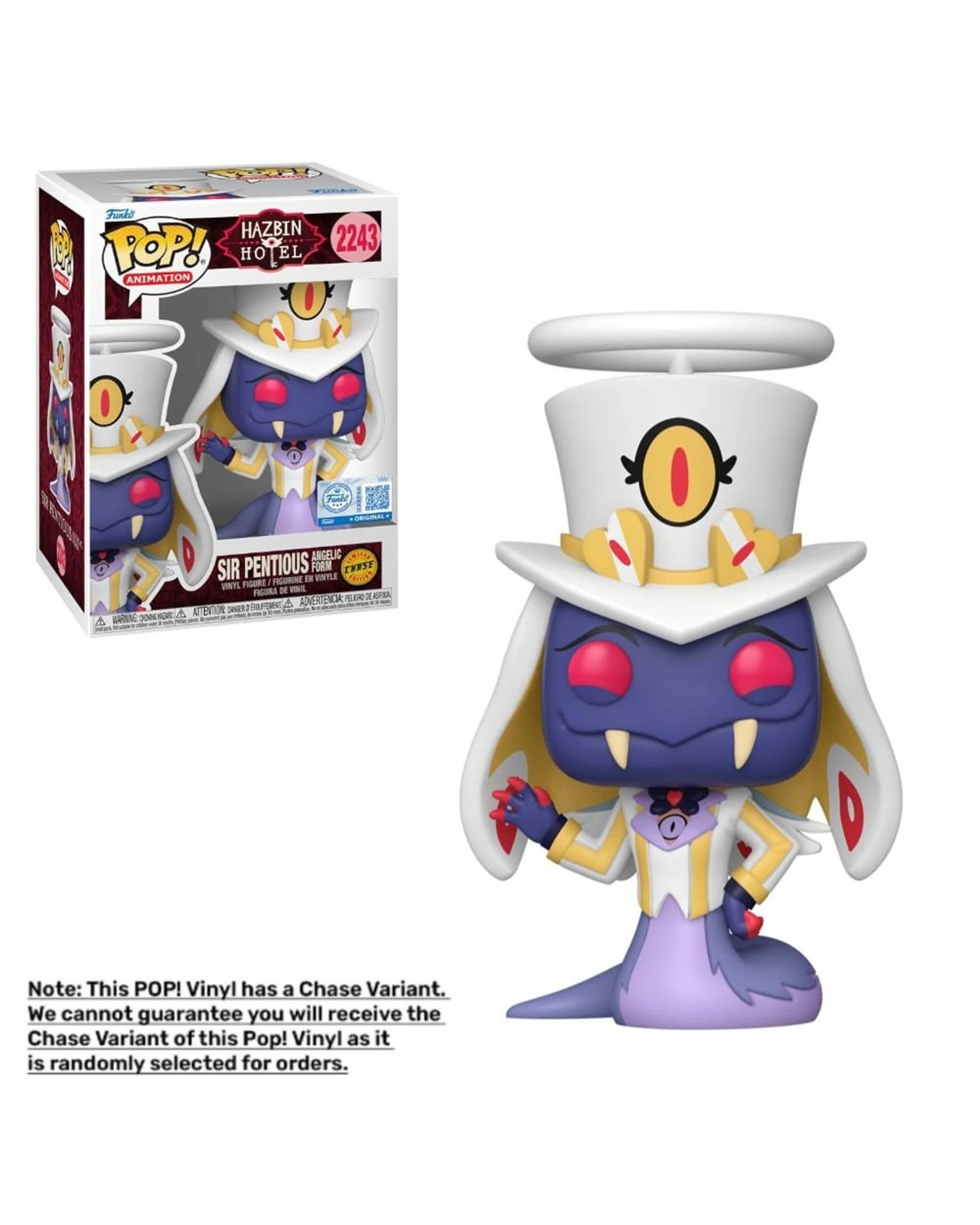 "NYAHAHA! I'm so evil!" The Hazbin Hotel cast is finally here in Pop! form! The Sir Pentious Pop! Vinyl Figure captures the snake demon's distinctive look, including a top hat, a long tail, and a yellow and black cobra hood. There's a 1 in 6 chance you may find the Angelic Form chase of Pop! Sir Pentious! Please note: Chase Variants are shipped at random. Receiving a Chase with purchase is not guaranteed, nor can it be requested. Add the Hazbin Hotel - Sir Pentious Pop! Vinyl Figure to your Funko Collection today! Ages: 3+Item Specifics
