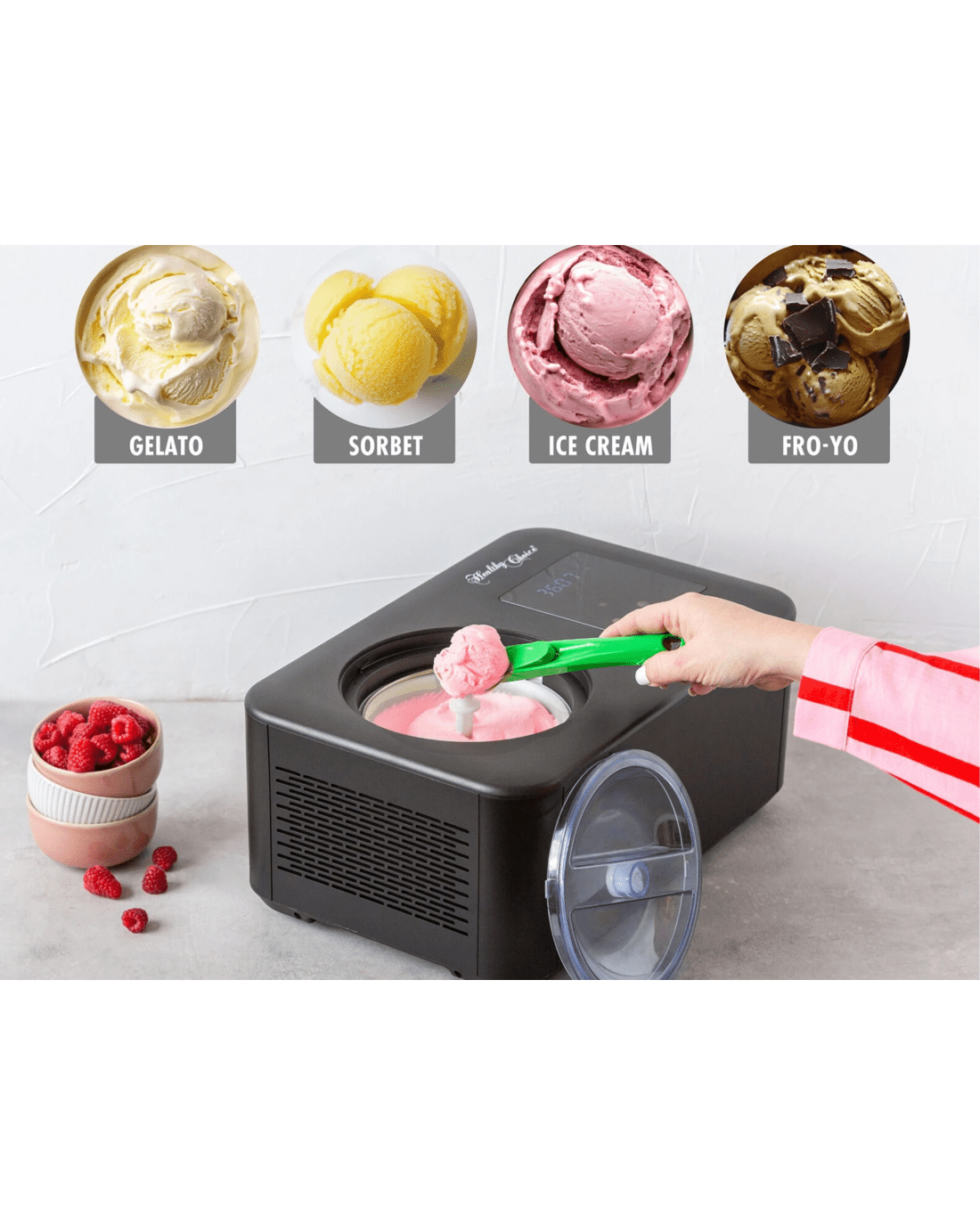Sold by GEM ElectronicsHealthy Choice 1.5L Portable Ice Cream and Soft Serve Maker with LED Touch Controls, Built-In Compressor & Accessories