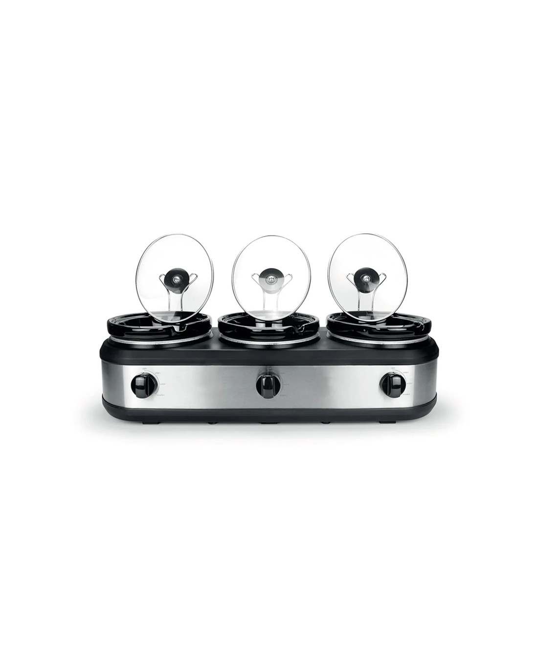 - Features: 3 removable non-stick ceramic cooking pots at 2.5 litre capacity each, 3 serving spoons, 3 tempered glass lids, 3 lid holders, 3 control knobs to control each cooking pot, off / low / high heat settings, 4 hours keep warm, cool-touch lid handles