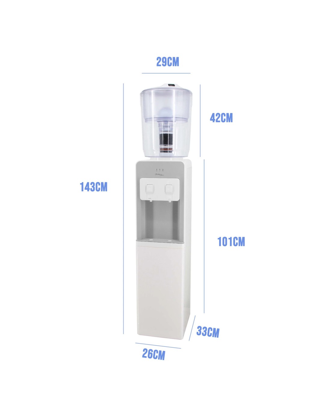This easy-to-assemble, slim design has a cooling capacity of 2 litres per hour, ensuring plenty of cool, hydration for the entire family or office. The 85 watts of power is both energy efficient and powerful, ready to tailor to your thirst quenching needs. The dispenser has 3 coloured lights on the front to easily indicate power, cooling mode, and cooled water mode. Enjoy your purified water at ease with the over-current and electric-shock protection. Complete with a handy swing-door storage space below the water taps, this nifty dispenser can store Replacement Water Purifier Filters or anything else you choose to put inside on the dual shelf.