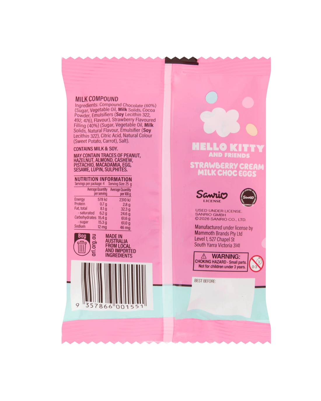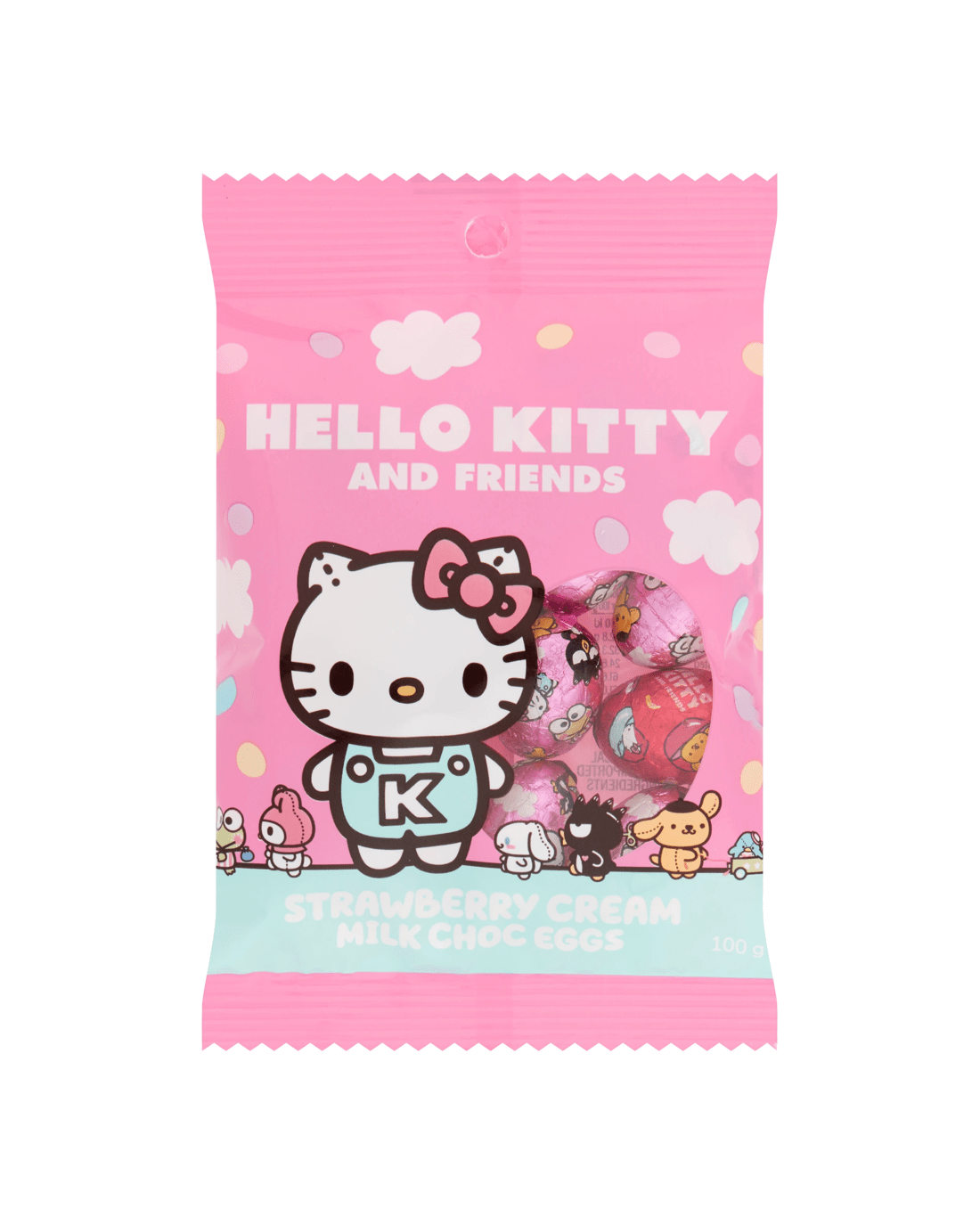 Enjoy delicious milk choc mini Easter eggs with strawberry cream centre. Wrapped in Hello Kitty and Friends branded foil and packed in a Hello Kitty 100g bag, these are perfect for sharing or for Easter egg hunts