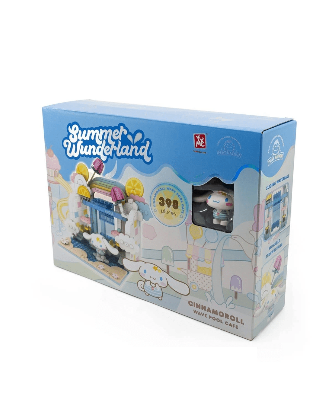 Cinnamoroll Wave Pool Cafe comes with 398 pieces, complete with a sliding waterfall and movable strawberries!