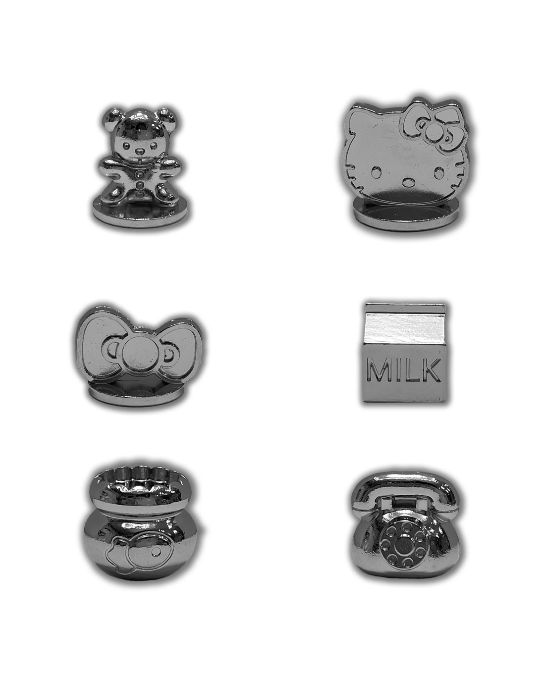 - INCLUDES 6 METAL TOKENS: choose from tokens including Telephone, Milk, Teddy, Bow, Hello Kitty, Fish Bowl, and tour Hello Kitty in cute and playful outfits and activities, like in her Halloween costume,running, swimming and Diving.
