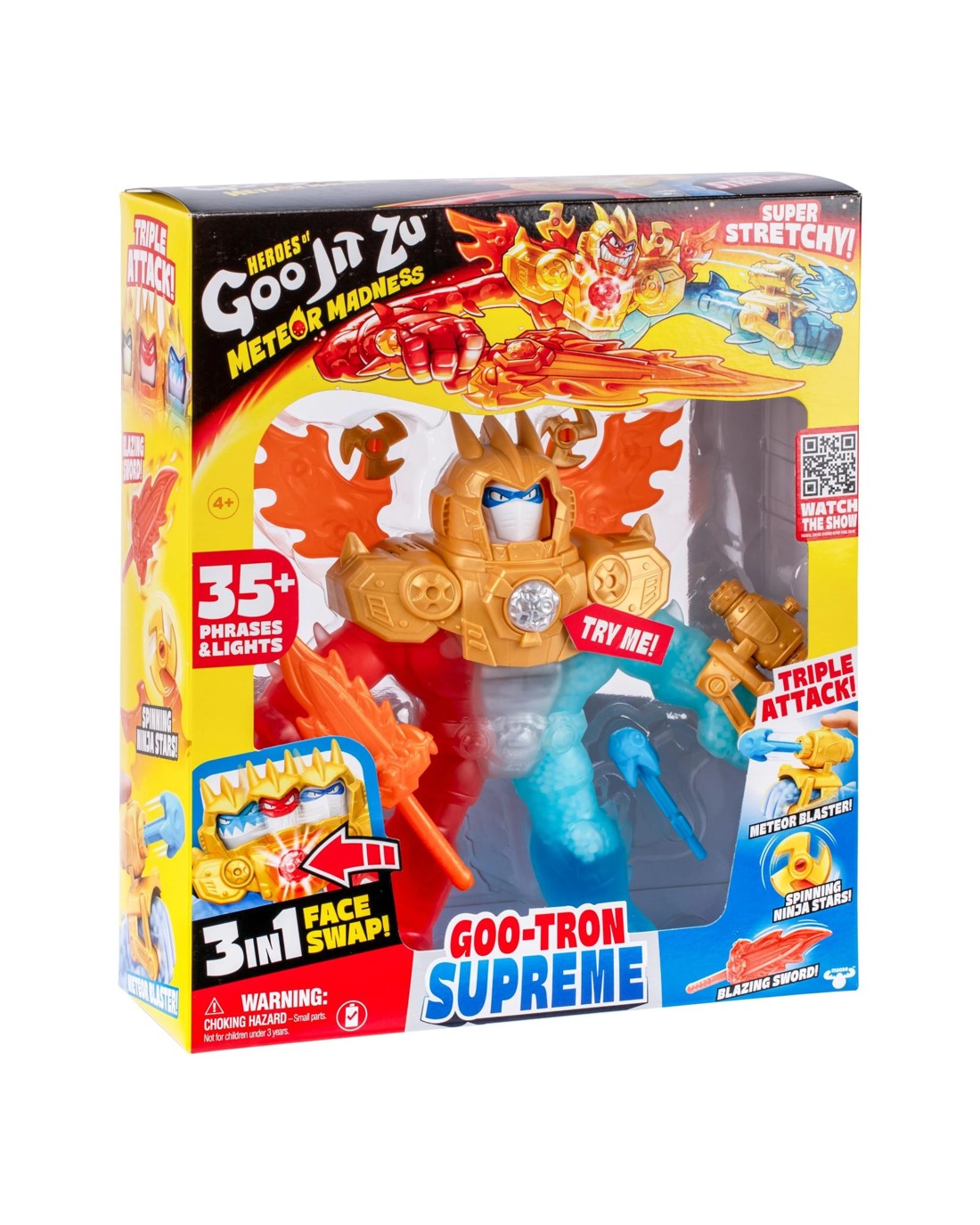 Stretched to the Extreme and coming straight for you!The all-new Heroes of Goo Jit Zu Meteor Madness: GooTron is here to stop Meteorax's meteor power before it destroys the world. Kids can watch the goo crew save the Goo-niverse in new YouTube episodes and recreate the action with this epic, stretchy hero. GooTron Supreme fuses Blazagon's strength, Pantaro's stealth, and Thrash's power. With over 35 phrases, lights, and triple-powered weapons, he's ready for battle. Stretch him three times his size, squish to reveal his goo fillings, and unleash ultimate mayhem. Get ready for the all-new Meteor Madness: GooTron Supreme! Ages 4 +