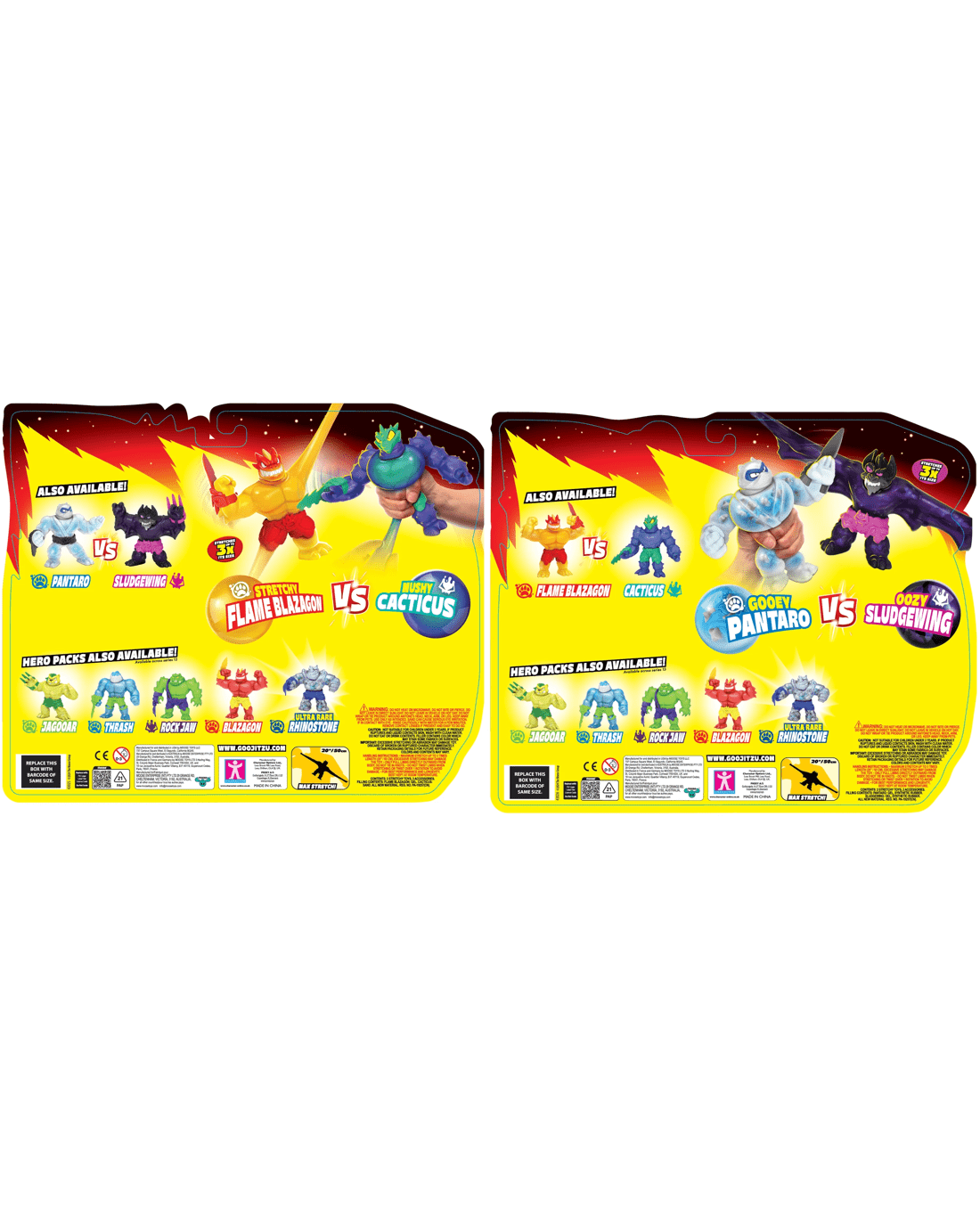 Stretched to the Extreme and coming straight for you! Brace yourself for a meteoric showdown with the all-new Heroes of Goo Jit Zu Meteor Madness Versus Packs. Heroes Blazagon and Pantaro are about to face their biggest, wildest challenge yet in a matchup for the ages! Will Blazagon’s fiery strength and Pantaro’s stealth be enough to defeat Cacticus and Sludgewing, or will evil prevail? Kids can watch Blazagon and Pantaro lead the Goo Crew to save the Goo-niverse from total devastation in brand-new episodes streaming on YouTube! Blazagon has been equipped with a flame sword, while Pantaro wields his sword, both equally powerful, interchangeable weapons designed for extreme stretch battle strikes against their fearsome foes – Cacticus and Sludgewing.