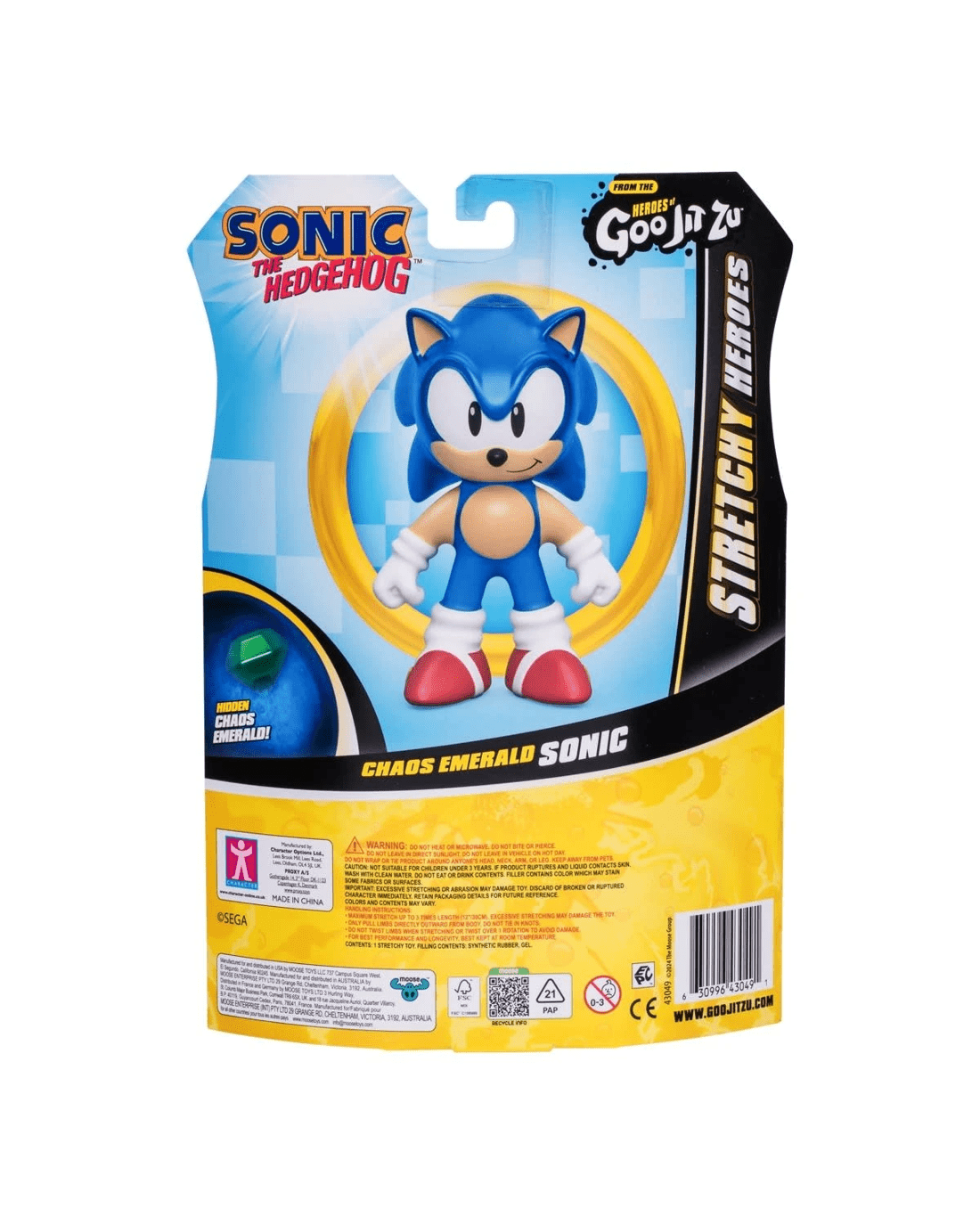 Look who's back with the Heroes of Goo Jit Zu - Sonic the Hedgehog! But now he's not just supersonic and super stretchy, he has become Chaos Emerald Sonic! Chaos Emerald Sonic has jumped out of the screen and into your hands! He is just as stretchy as before, but now he has a powerful Chaos Emerald hidden inside his goo-filled body! Squeeze, stretch and play with him like never before! Squeeze Sonic's body to discover and reveal the Chaos Emerald within his Goo! Grab him by his limbs and stretch out his arms and legs. Sonic stands at over 4-inch / 10cm tall. Wow! He can stretch up to three times his size! (His arms can stretch up to 16-inch / 40cm!) Let him go and watch him return to his original shape and size! Heroes of Goo Jit Zu are the new gooey, stretchy way to play with your favourite toy characters - with no mess. Discover a new way to play and help Chaos Emerald Sonic save the day!