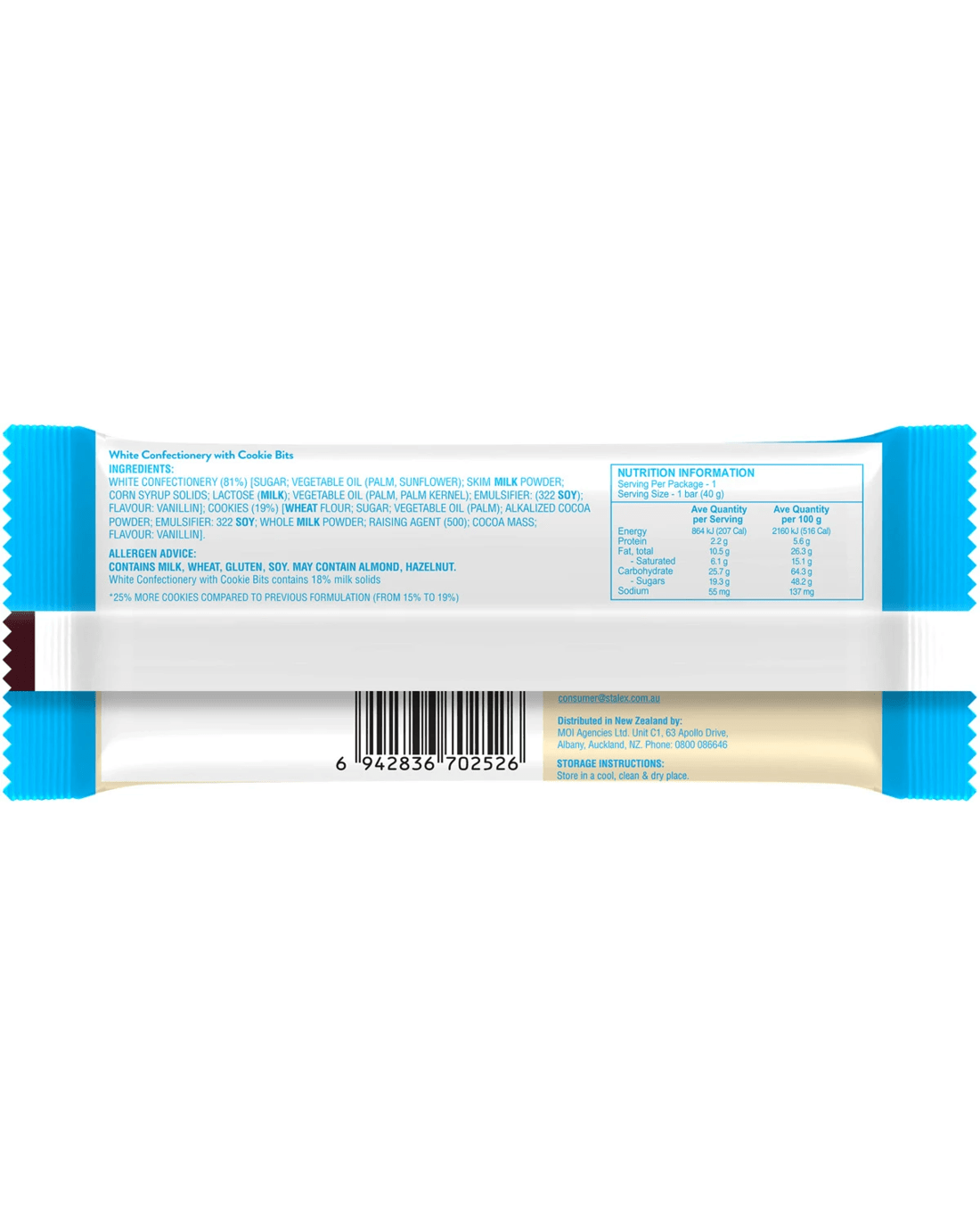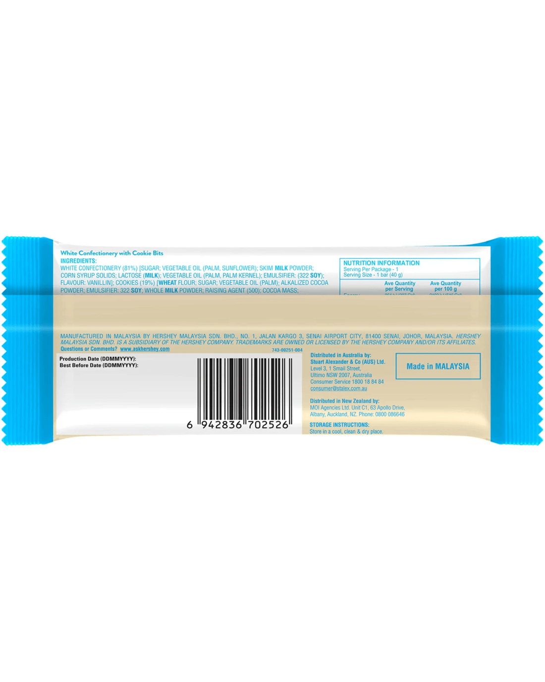 • Ingredients: White Chocolate Compound (81%) [Sugar, Vegetable Oil (Palm, Sunflower), Skim Milk Powder, Corn Syrup Solids, Lactose (Milk),Vegetable Oil (Palm , Palm Kernel), Emulsifier (322 Soy), Flavour (Vanillin)], Cookies (19%) [Wheat Flour,Sugar, Vegetable Oil (Palm), Alkalized Cocoa Powder, Emulsifier, 322 Soy, Whole Milk Powder, Raisin Agent (500), Cocoa Mass, Flavour (Vanillin)