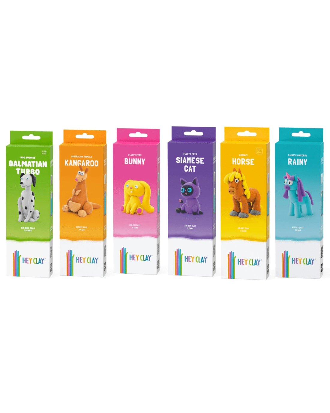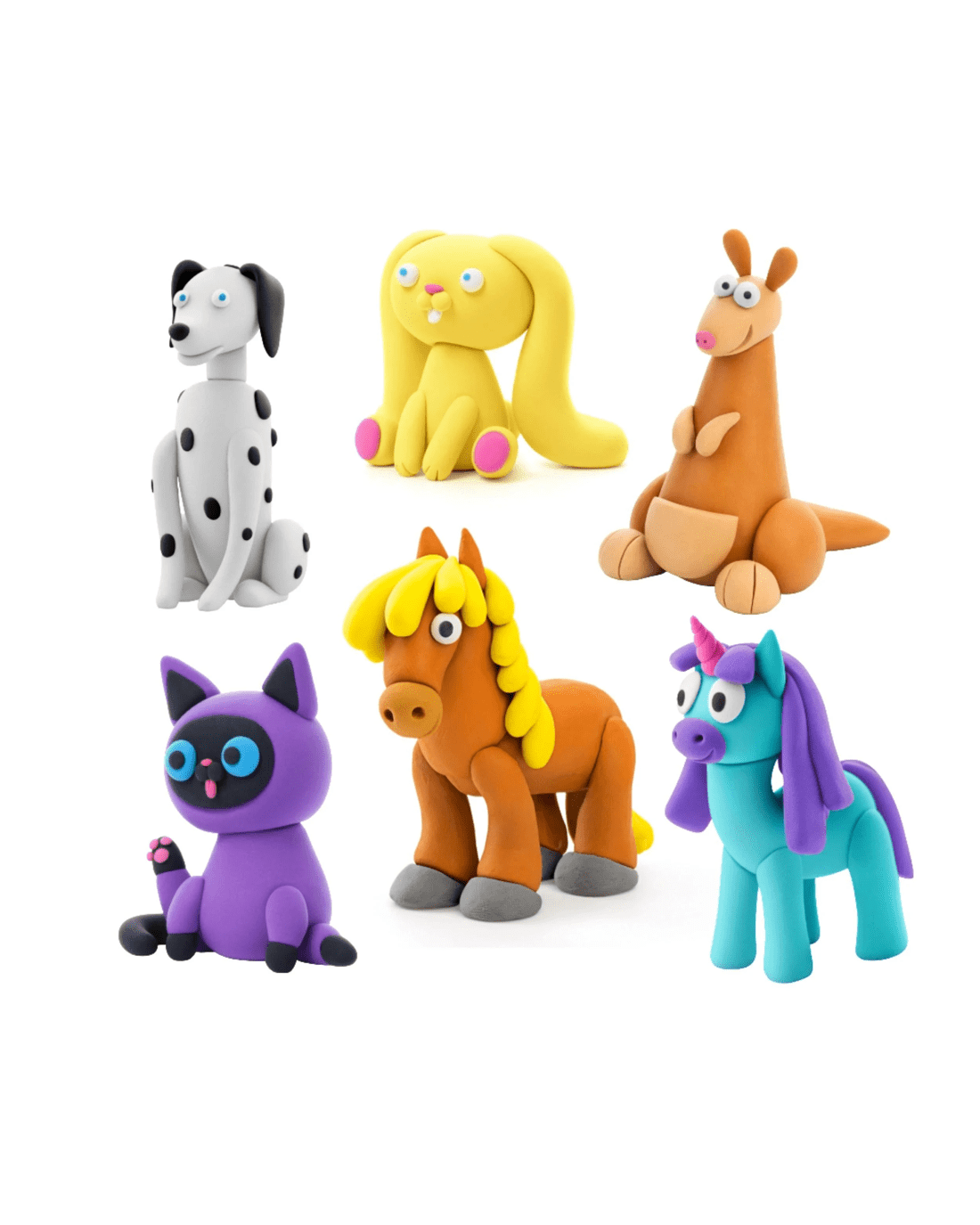 - Pack includes 3 cans of clay enabling you to make 1 of the following animals (Only) Bunny, Siamese Cat, Horse, Kangaroo, Dalmation, Unicorn