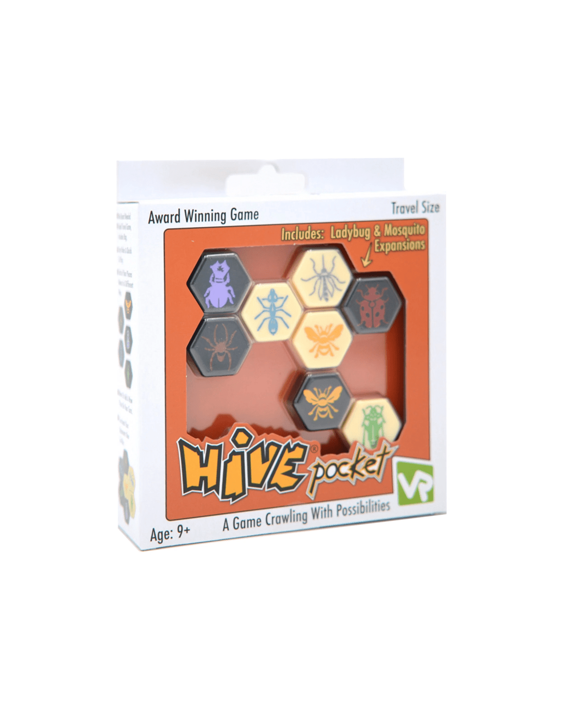 Hive Pocket® is the travel version of the award-winning game, Hive! This version includes 26 beautifully crafted Hive pieces, a drawstring storage bag and two expansions to the game: ‘The Mosquito’ and ‘The Ladybug’.