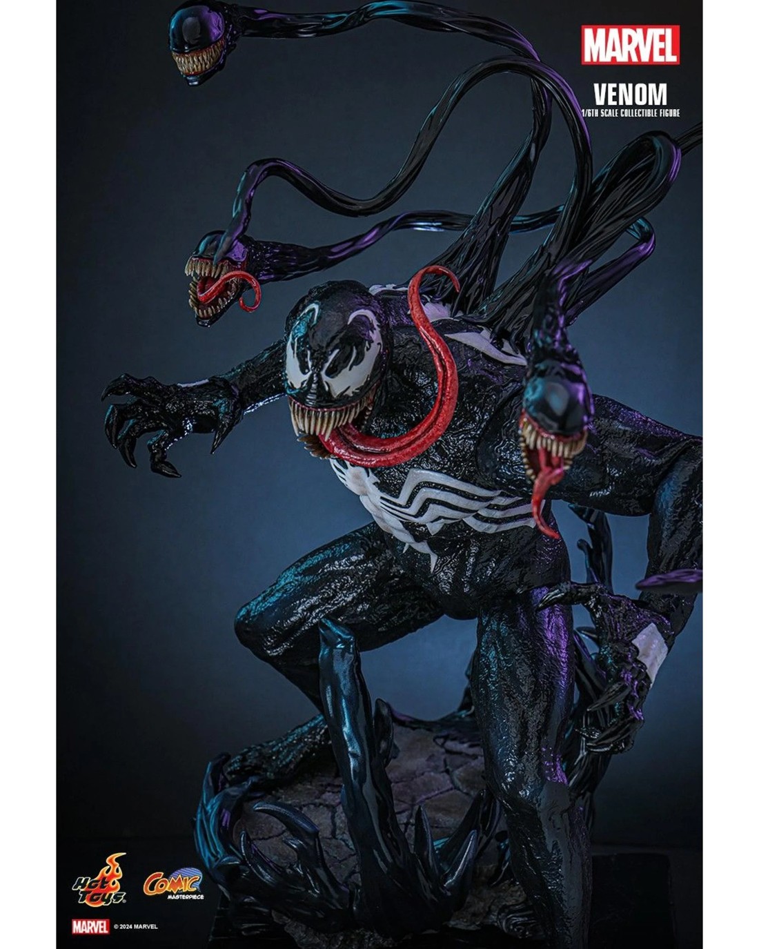 Venom is a striking anti-hero in Marvel Comics, known for his terrifying black symbiote that enhances his host, Eddie Brock. Born from an alien organism, Venom grants superhuman strength and agility, along with the ability to shape-shift. Initially a foe of Spider-Man, he embodies a complex mix of vengeance and protection, often blurring the lines between hero and villain. His menacing appearance, featuring a toothy grin and white spider emblem, makes him one of Marvel's most recognizable figures.Hot Toys is thrilled to present a stunning 1/6th scale collectible figure of Venom, inspired by the iconic Marvel Comics anti-hero. This meticulously crafted figure captures the essence of Venom, showcasing his menacing presence and intricate details.The greatly detailed collectible figure is expertly crafted to represent Venom from Marvel Comics It features a strikingly grinning head sculpt, as well as a head with a menacing fanged mouth and three interchangeable protruding tongues. Standing at approximately 39 cm tall and featuring iconic white spider emblems, the specialized body showcases a high level of detailed sculpting, especially on the skin texture. It includes several symbiote accessories with tentacles that can be attached to the figure's back, enhancing the dynamic presence of this iconic character. The collectible also comes with a symbiote-themed diorama base that brings the comic scene to life.