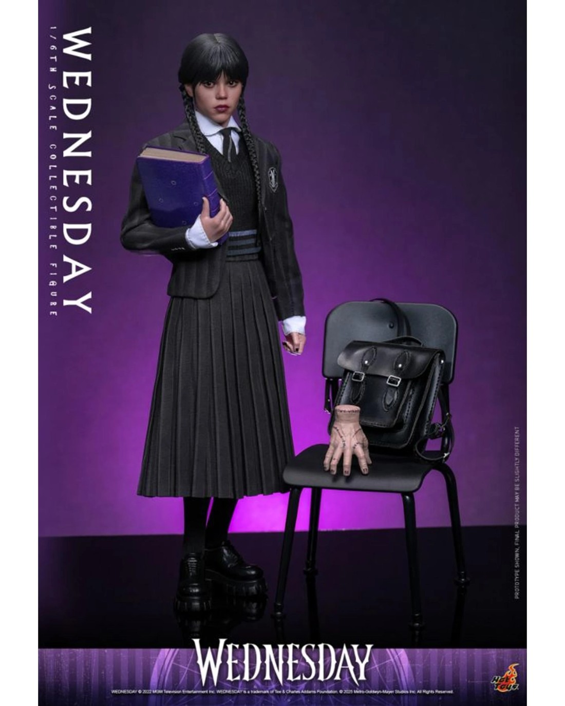 Hot Toys proudly presents the 1/6th scale Wednesday Collectible Figure, inspired by Jenna Ortega's unforgettable portrayal of Wednesday from the Netflix series Wednesday. This screen-accurate figure features a newly developed head sculpt with separate rolling eyeballs, meticulously crafted black hair sculpt with braided pigtails detail, and screen-accurate facial expression, skin texture, and makeup to capture Wednesday's signature deadpan charm. The figure uses a newly developed body, standing approximately 27cm tall with 25 points of articulation, replicating her physique in the show. It comes with eight newly developed interchangeable hands for a variety of expressive poses, from her iconic finger snap to holding a range of different accessories. The figure is dressed in the precisely tailored Nevermore Academy uniform, including a striped blazer with magnetic shoulder features, a sweater vest, a dress shirt, a tie, a striped pleated skirt, a pair of tights, and a pair of shoes. Packed with a range of accessories, the set includes a satchel backpack, umbrella, cello with bow, chair, tracker device monitor, crystal ball with carrying case, and the Nightshade Society Journal featuring the prophetic drawing of Wednesday Addams and Joseph Crackstone. Thing is not to be missed, and he comes as an accessory in three different states, including regular state, finger snapping gesture, and thumbs up gesture. It's also magnetically attachable to Wednesday's shoulders for dynamic display options. A specially designed round stone floor-themed figure stand with the Wednesday logo completes this dark presentation, making it a must-have collectible figure for fans of Wednesday.