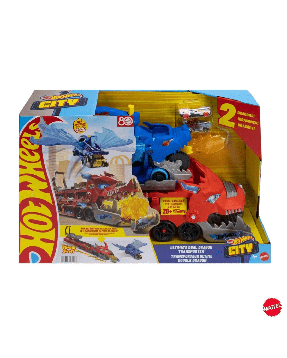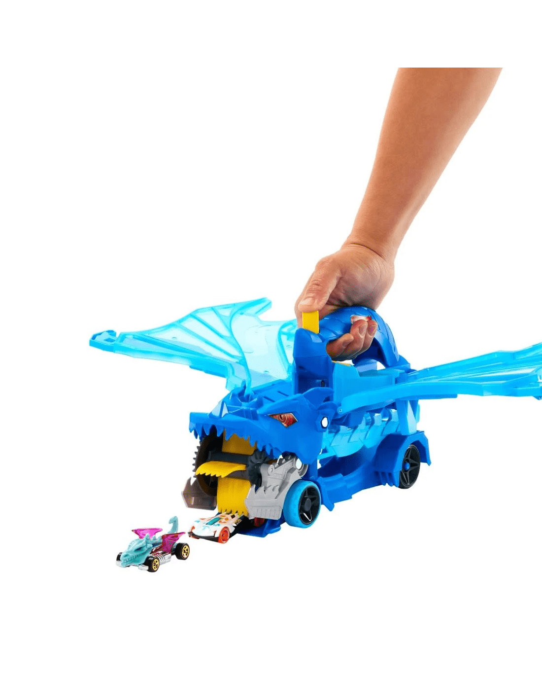 Drive into battle with this large-scale dragon hauler that features an additional detachable dragon that eats toy vehicles! After knocking out cars with the fire-breathing dragon, unlock the smaller dragon and transform it into racetrack! Press the button to make its wings move and emulate a real dragon, then swoop in to make it eat cars. Return to the base and release the vehicles into the launchers where they can take off on side-by-side tracks! The hauler includes two 1:64 scale cars, but kids can store more than 20 vehicles in and on the two dragons. (Additional cars sold separately). Launch out or connect Hot Wheels track to the front for on-track play.