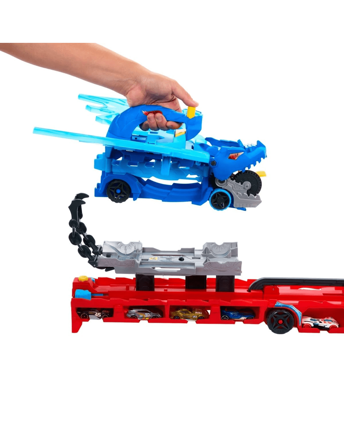 - Two 1:64 scale die-cast Hot Wheels vehicles are included and the dragons can haul more than 20. (Additional vehicles sold separately.)