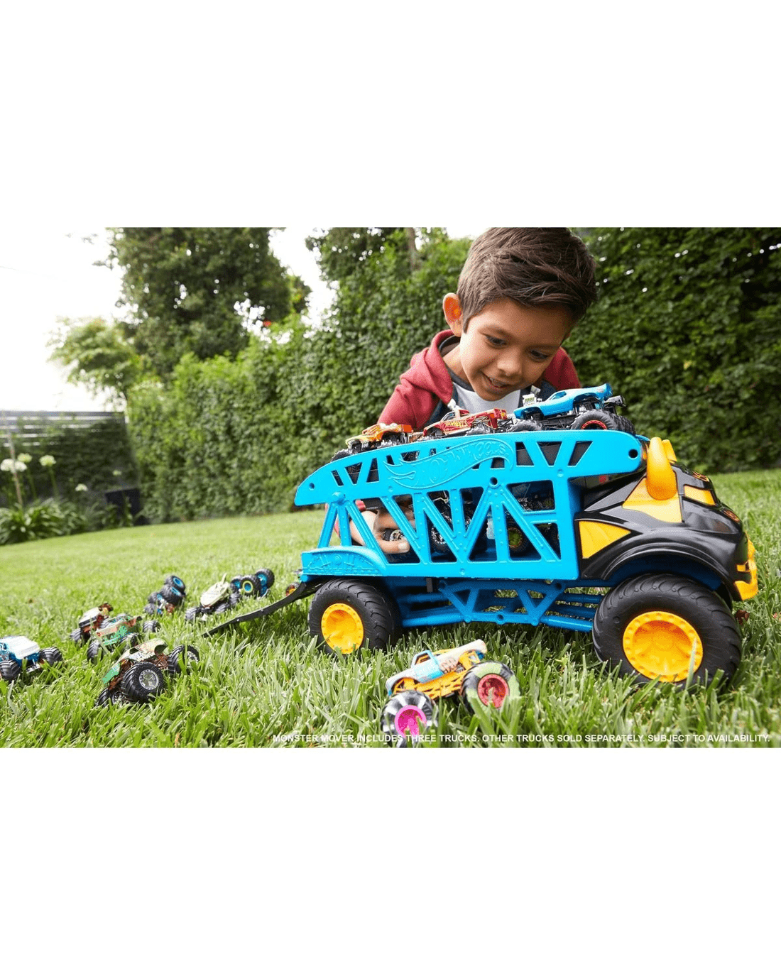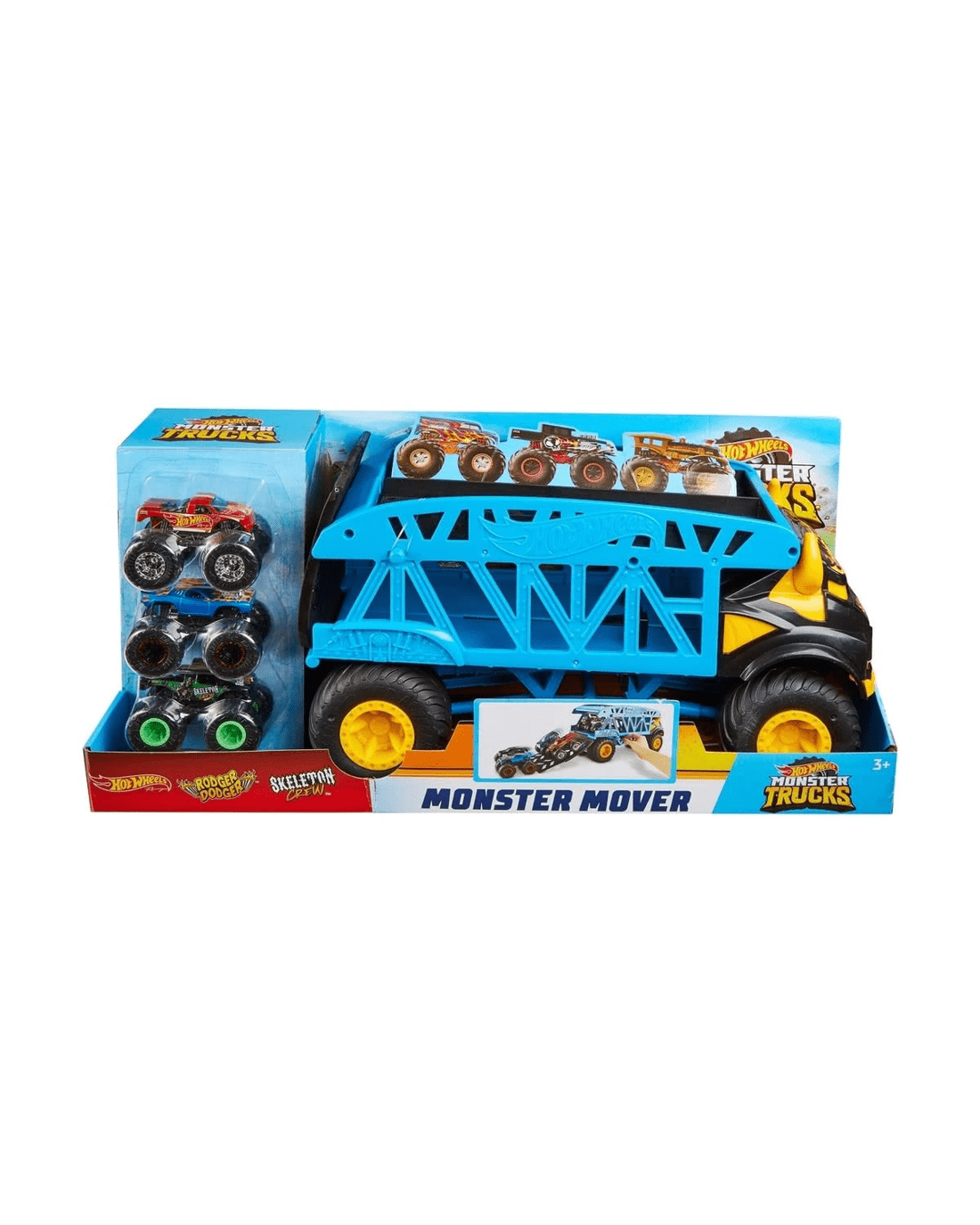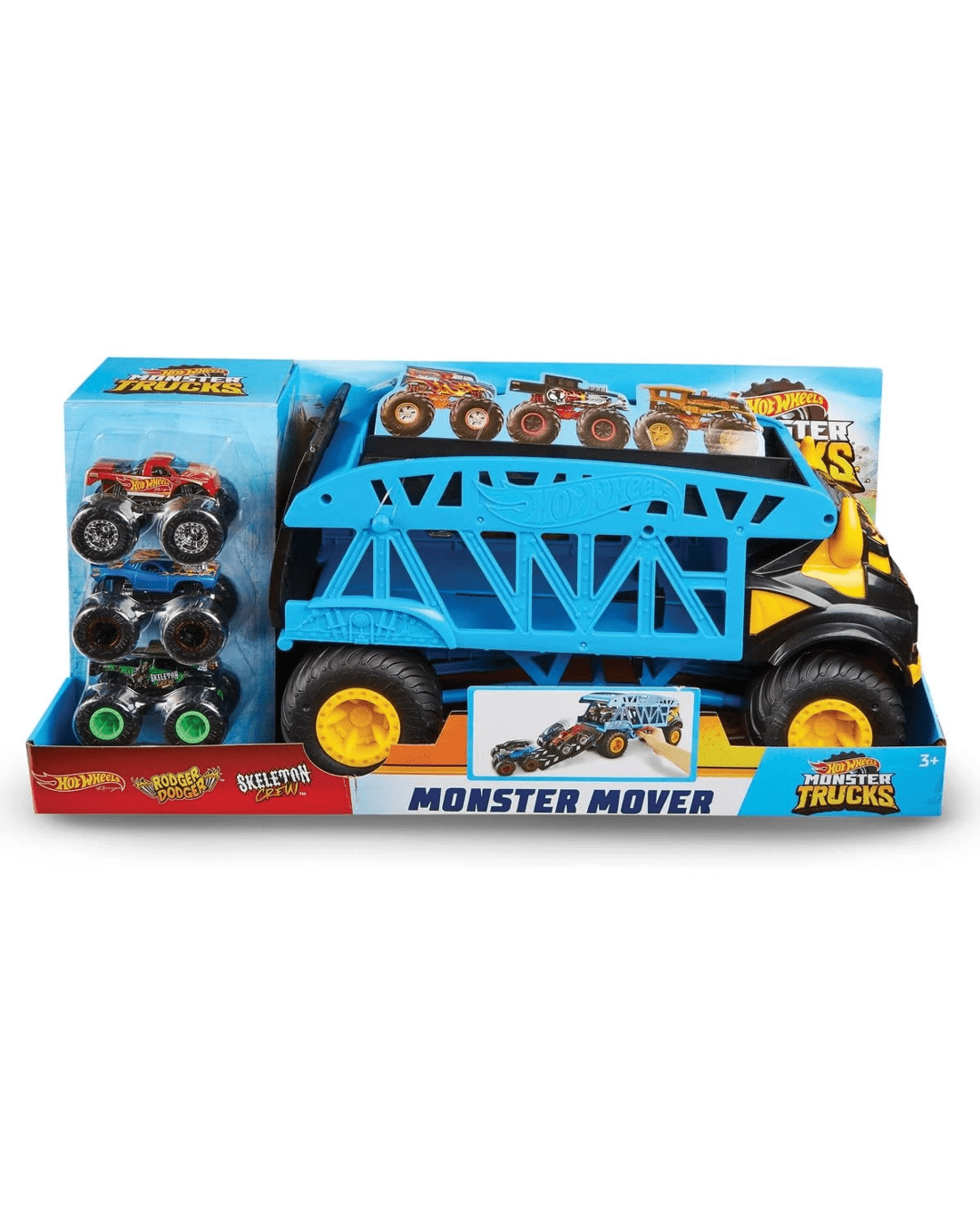 Get home this 'Transport, store and organise kids' collection' of 1:64 scale monster trucks. Kids can transport Hot Wheels Monster Trucks with this large-scale Monster Mover that stores up to 12 trucks which kids can launch into action from the rear ramp with the flip of a switch. It has signature giant tires for rolling over obstacles. This truck organiser is designed like Steer Clear, one of Hot Wheels' most iconic trucks. The bundle includes three cool Monster Trucks - Skeleton Crew, Rodger Dodger and the Hot Wheels Racing monster truck. Great value and the perfect gift idea for out-of-the-box crashing and smashing action. Go BIG, go Hot Wheels!