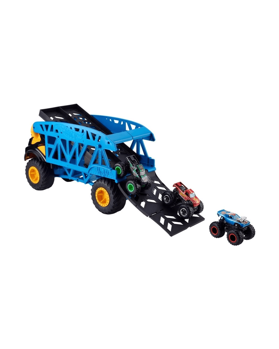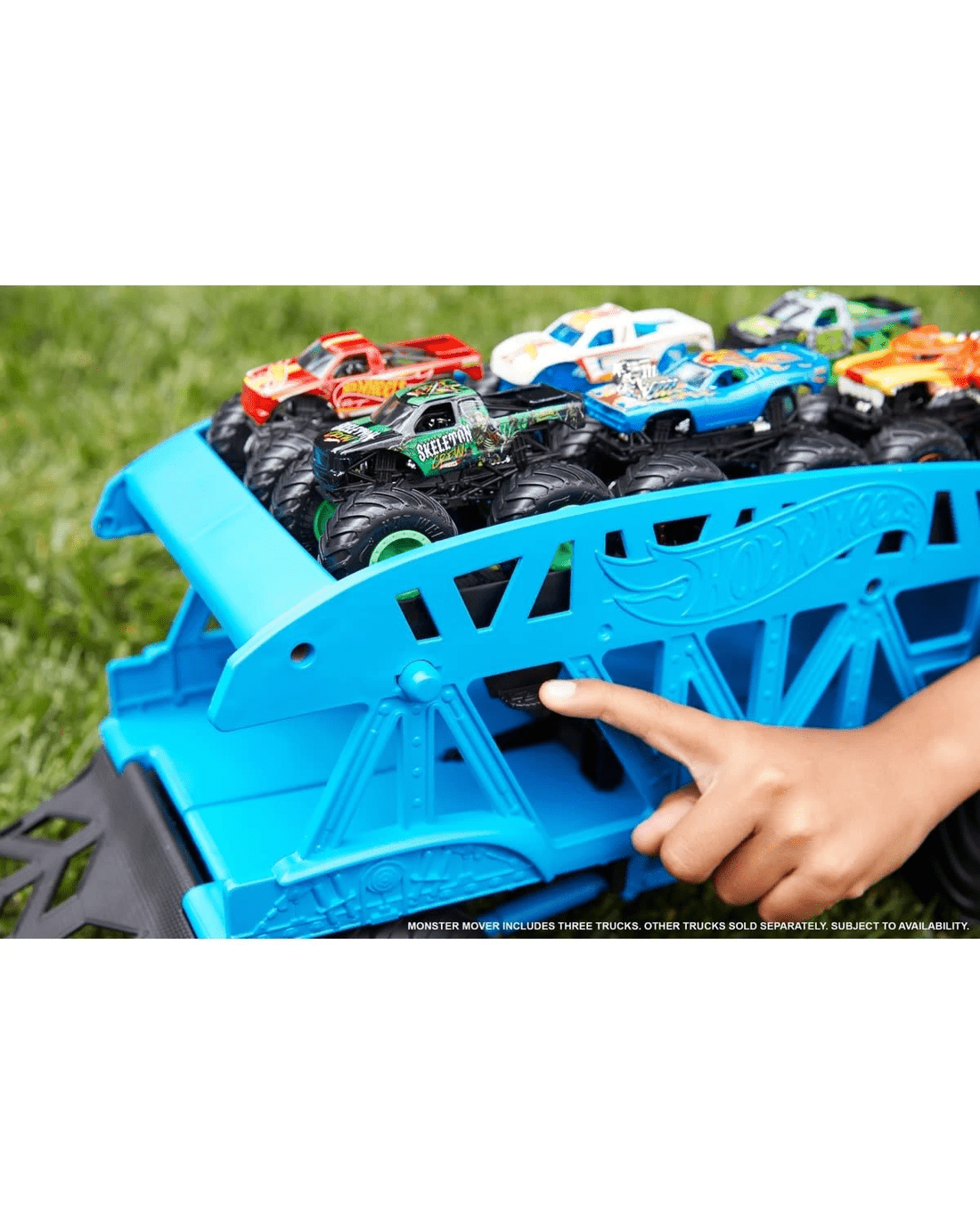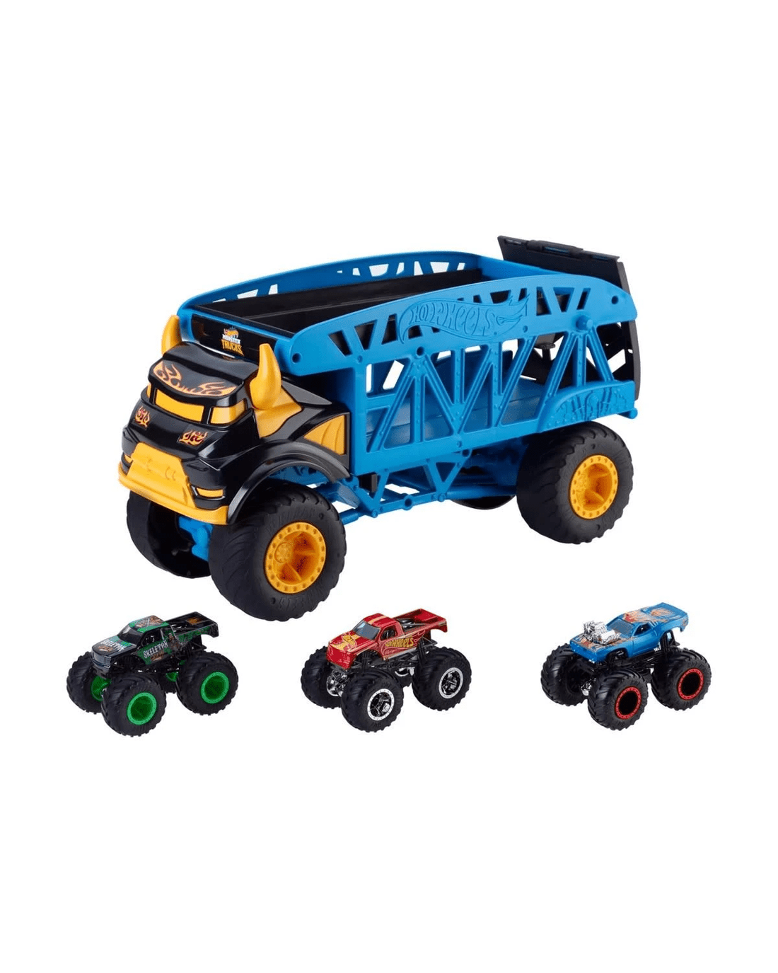 Get home this 'Transport, store and organise kids' collection' of 1:64 scale monster trucks. Kids can transport Hot Wheels Monster Trucks with this large-scale Monster Mover that stores up to 12 trucks which kids can launch into action from the rear ramp with the flip of a switch. It has signature giant tires for rolling over obstacles. This truck organiser is designed like Steer Clear, one of Hot Wheels' most iconic trucks. The bundle includes three cool Monster Trucks - Skeleton Crew, Rodger Dodger and the Hot Wheels Racing monster truck. Great value and the perfect gift idea for out-of-the-box crashing and smashing action. Go BIG, go Hot Wheels!