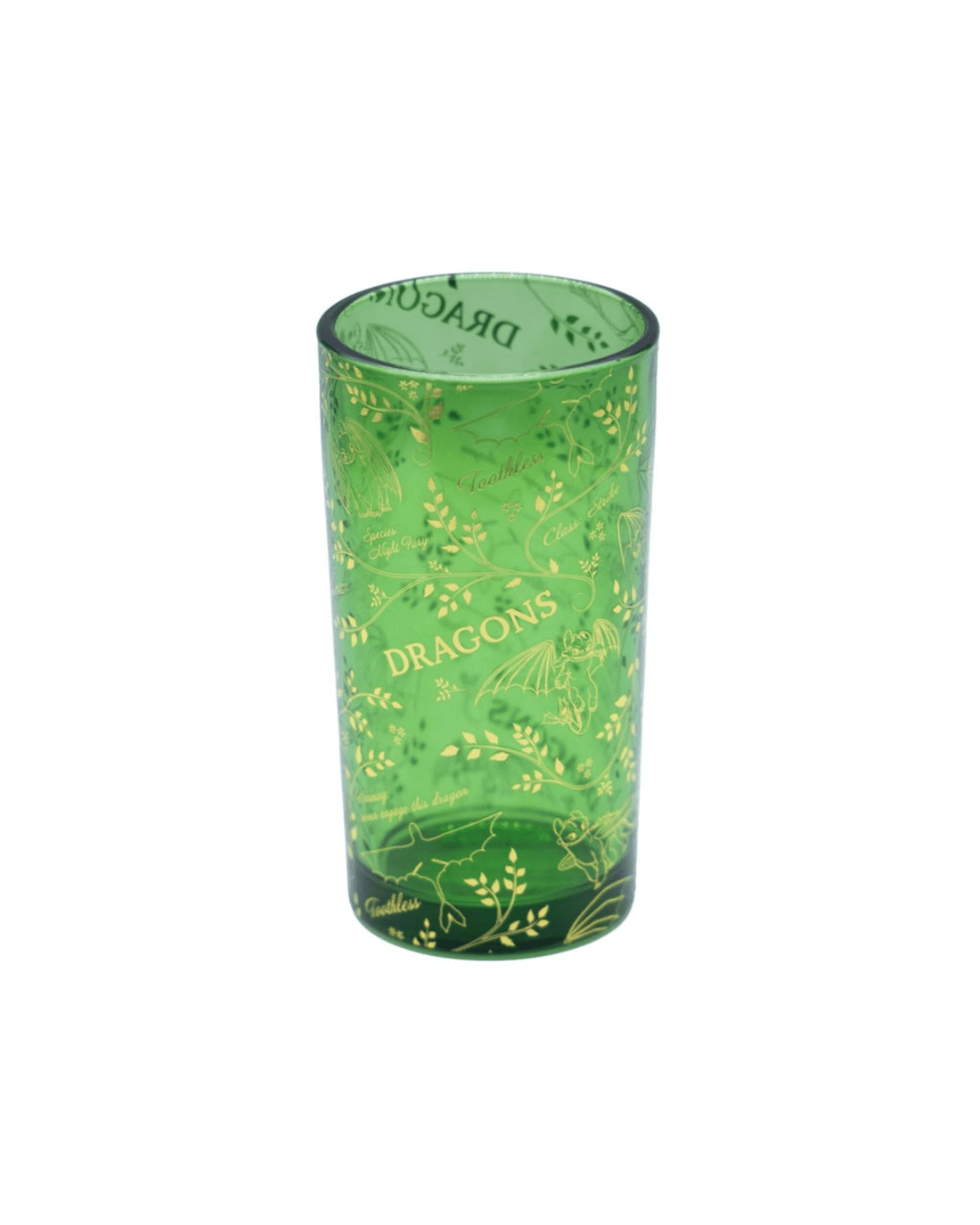 Sturdy glass tumbler with printed colour artwork featuring Toothless and a gold leaf print