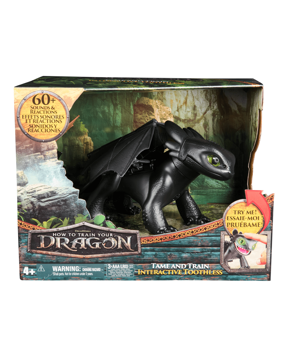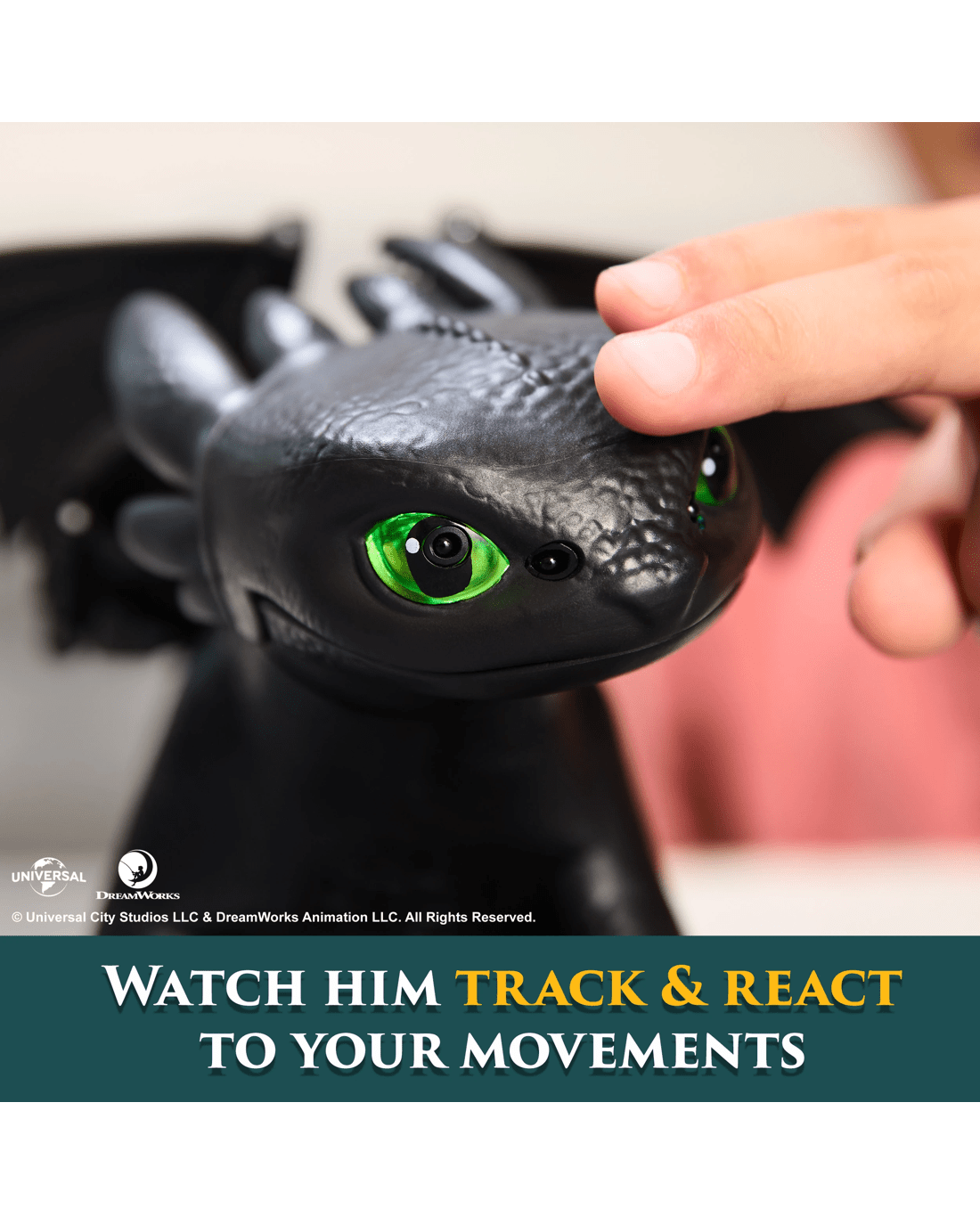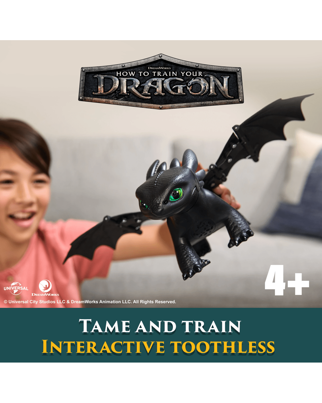 Bring the adventure of How To Train Your Dragon home with the Tame & Train Interactive Toothless dragon toy. Open the packaging 'cage' to welcome your very own Toothless. Earn his trust by holding his favorite snack, the included fish, as he locks on and tracks the fish and your movements. Grow your bond with Toothless as he goes from wild to tame with 5 different personalities. Unlock games with Toothless like 'keep away', 'follow me', and 'chicken' to discover more reactions and sounds from the Night Fury. Achieve the final bond to witness his plasma attack with spring loaded 20-inch wings and blue flashing eyes. Lift Toothless for flight sounds with your newly bonded dragon. Batteries included. Kids can recreate their favorite scenes or invent new stories as they dive into pretend play and sensory play with this engaging dragon figure. Start your adventures with ideal pretend play toys for ages 5-7. Whether it's for a birthday, holiday, or any celebration, this dragon figurine is an exciting option for young fans to inspire imaginative play and heroic adventures. Explore more thrilling adventures with Battle Dragons action figures, flying RC Toothless, board games, toy figures & playsets, Vikings figurines, stuffed animals and plush toys.