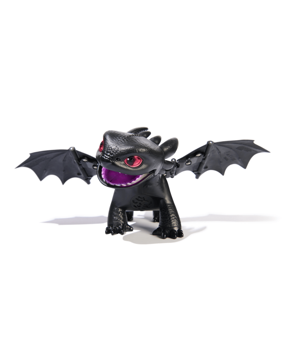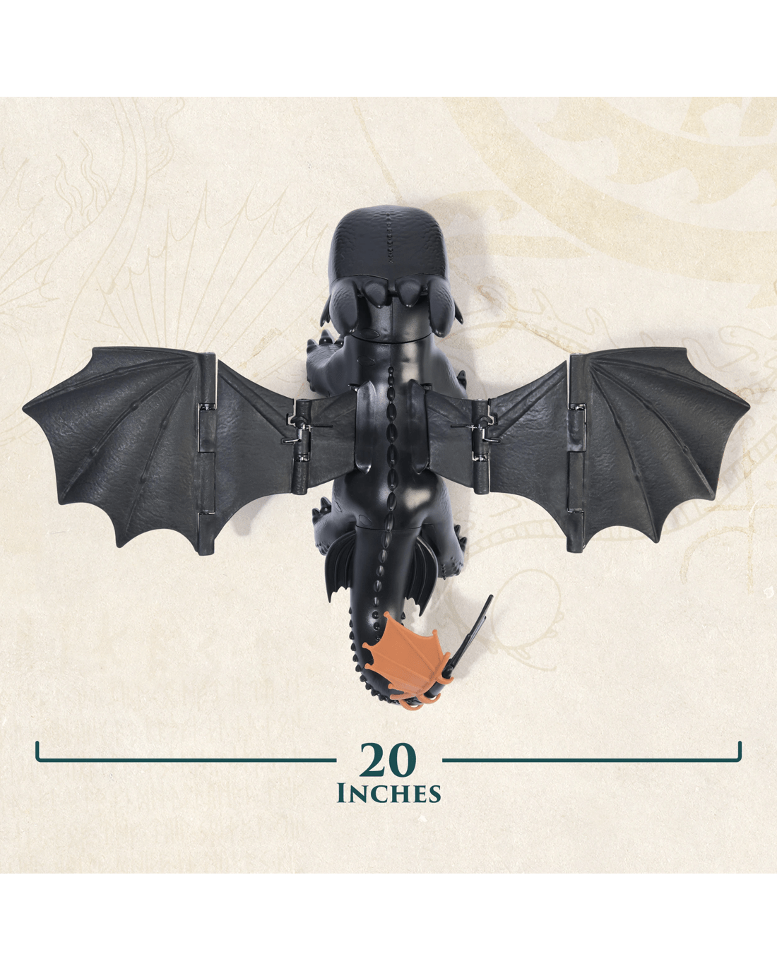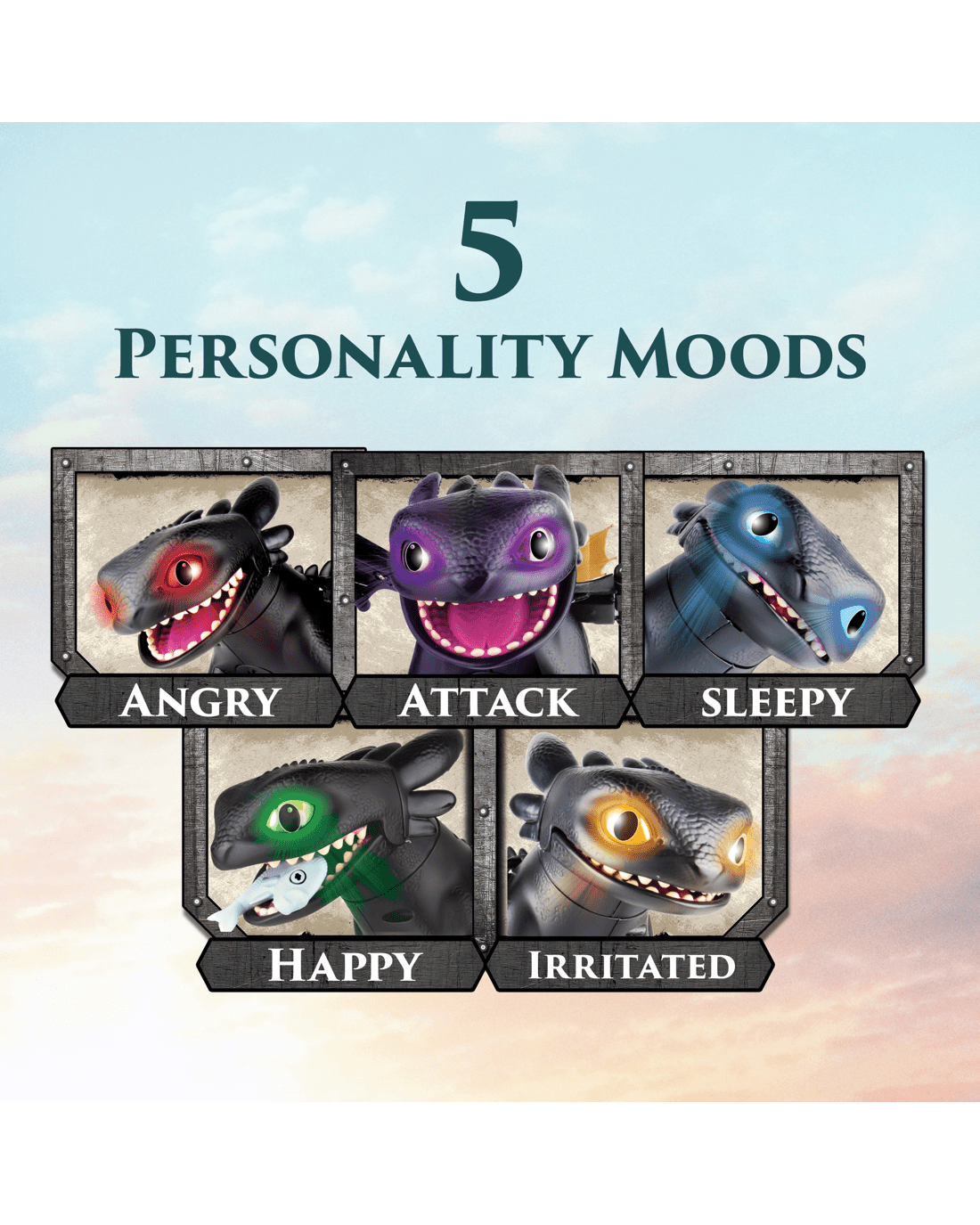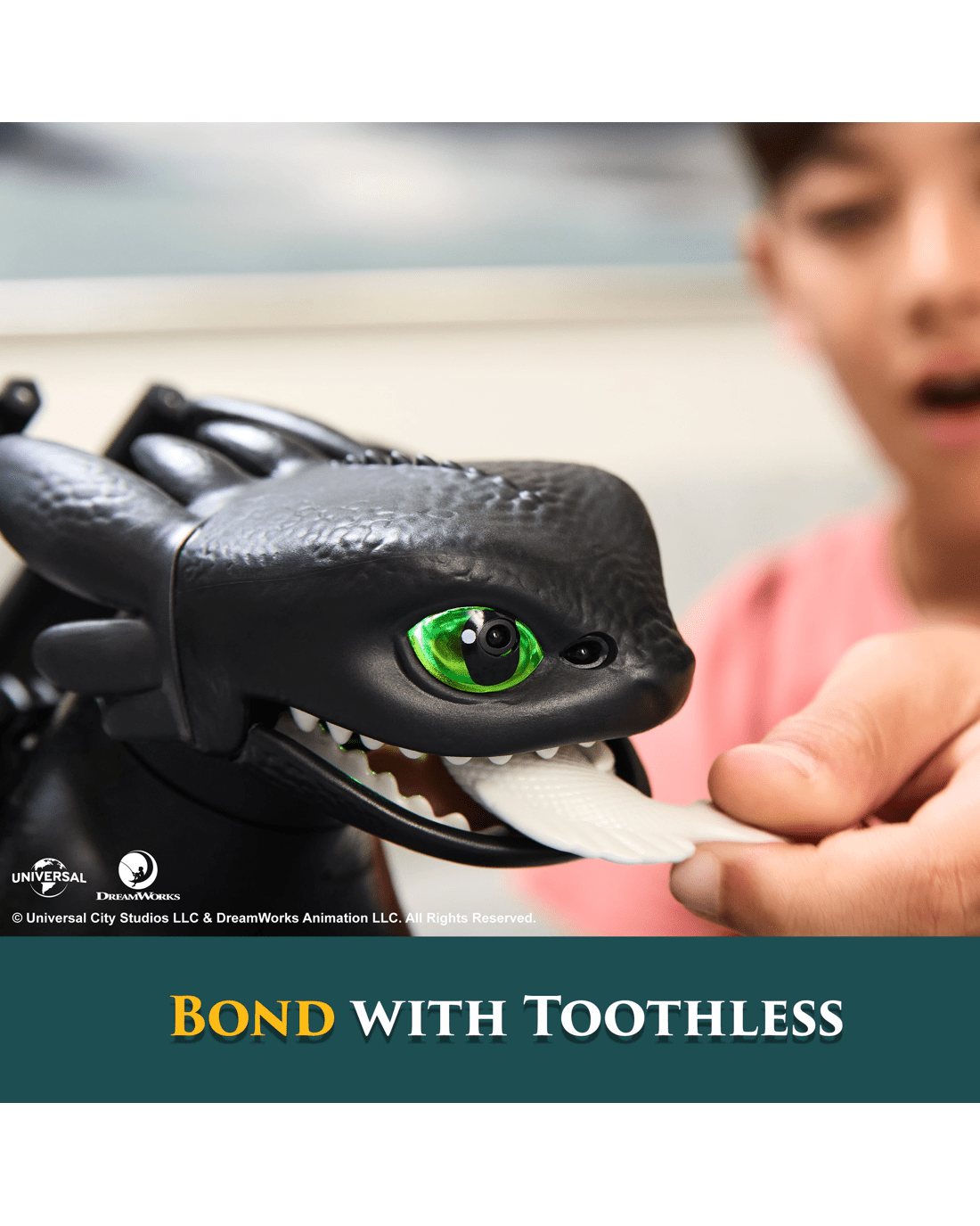 Bring the adventure of How To Train Your Dragon home with the Tame & Train Interactive Toothless dragon toy. Open the packaging 'cage' to welcome your very own Toothless. Earn his trust by holding his favorite snack, the included fish, as he locks on and tracks the fish and your movements. Grow your bond with Toothless as he goes from wild to tame with 5 different personalities. Unlock games with Toothless like 'keep away', 'follow me', and 'chicken' to discover more reactions and sounds from the Night Fury. Achieve the final bond to witness his plasma attack with spring loaded 20-inch wings and blue flashing eyes. Lift Toothless for flight sounds with your newly bonded dragon. Batteries included. Kids can recreate their favorite scenes or invent new stories as they dive into pretend play and sensory play with this engaging dragon figure. Start your adventures with ideal pretend play toys for ages 5-7. Whether it's for a birthday, holiday, or any celebration, this dragon figurine is an exciting option for young fans to inspire imaginative play and heroic adventures. Explore more thrilling adventures with Battle Dragons action figures, flying RC Toothless, board games, toy figures & playsets, Vikings figurines, stuffed animals and plush toys.