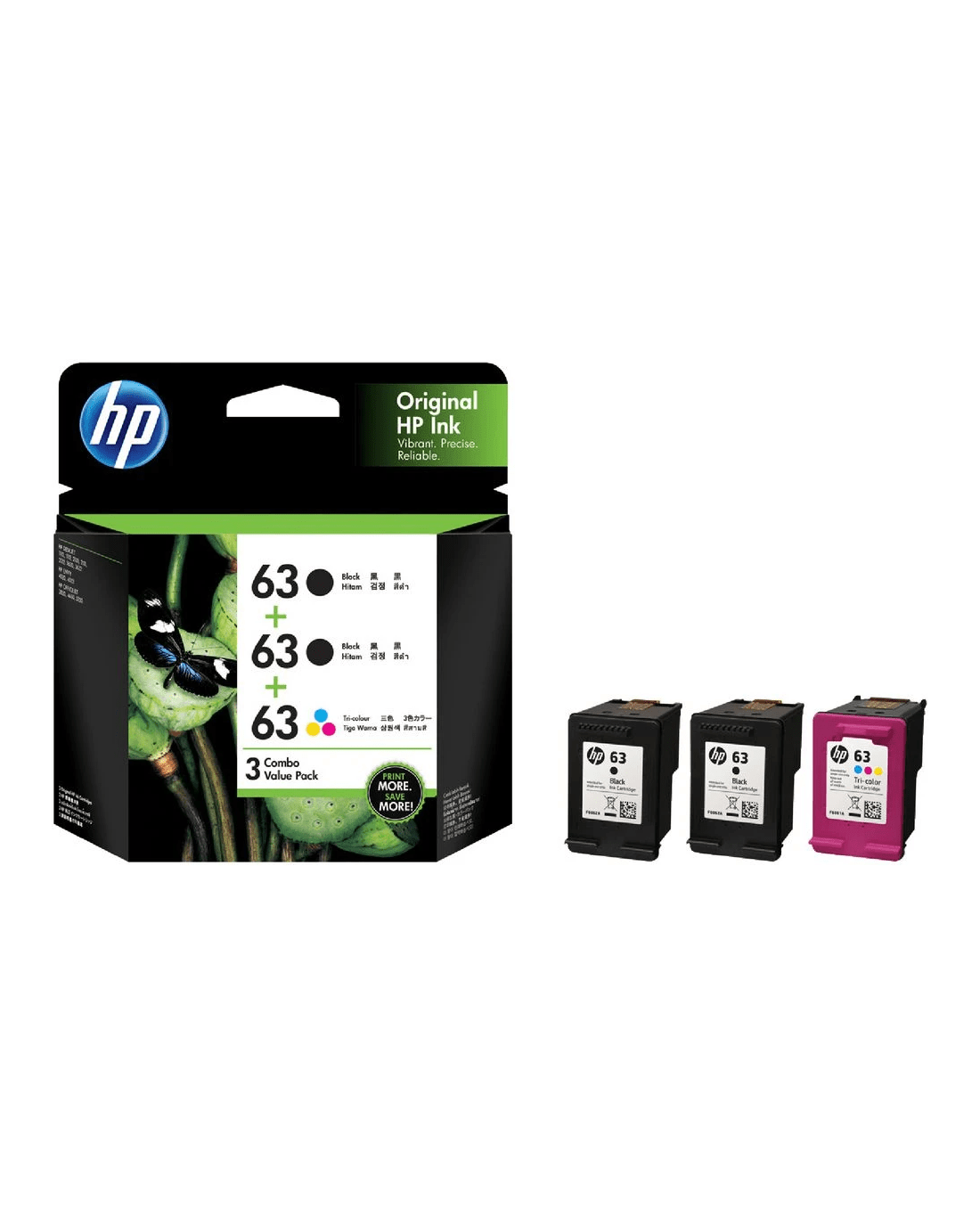 This HP 63 Black and Colour Ink Cartridges Combo Value Pack contains 3 cartridges, 2 black and 1 tri-colour so you can replace all your cartridges at once. Dual drop technology allows for precise ink placement and enhanced detail in your documents.