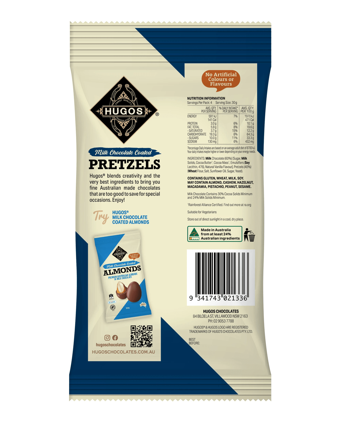 - Ingredients: Milk Chocolate (57%) [Sugar, Milk Solids, Cocoa Butter, Cocoa Mass, Emulsifiers (Soy Lecithin 322, 476), Natural Vanilla Flavour], Pretzels (43%) [Wheat Flour, Vegetable Oil, Yeast, Salt]