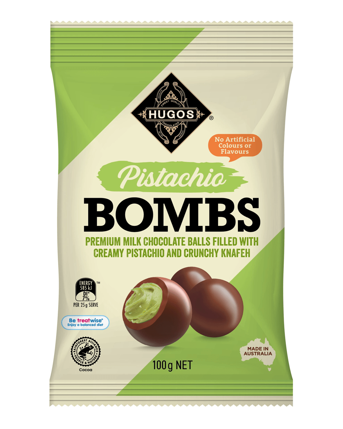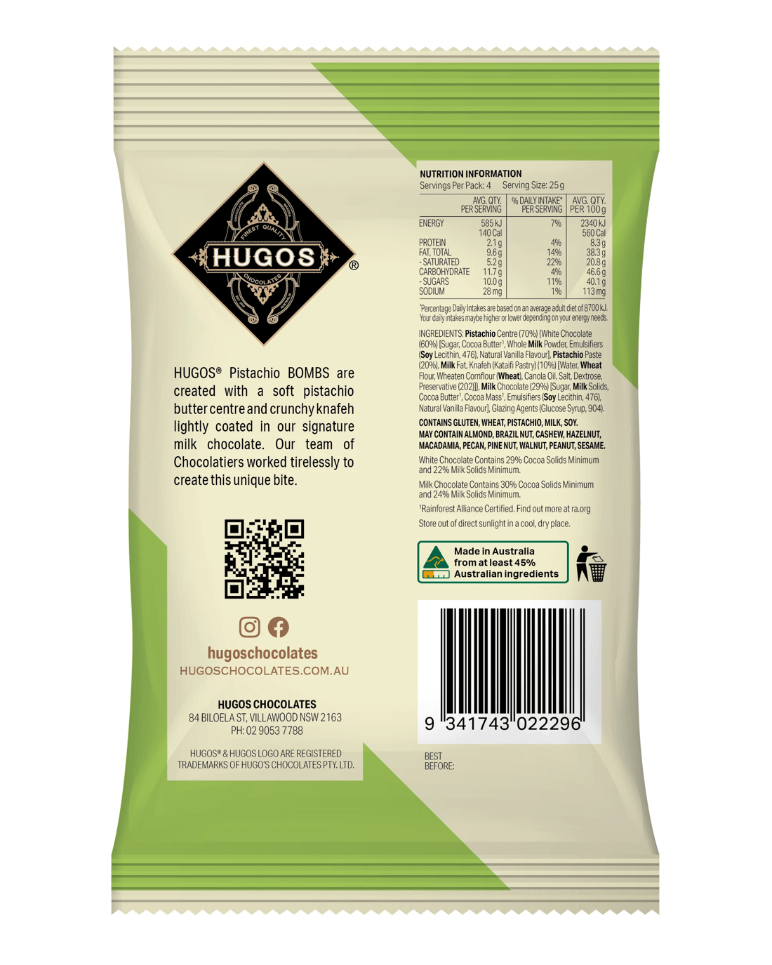 • Hugos Pistachio Bombs are created with a soft pistachio butter centre and crunchy knafeh lightly coated in our signature milk chocolate. Our team of Chocolatiers worked tirelessly to create this unique bite