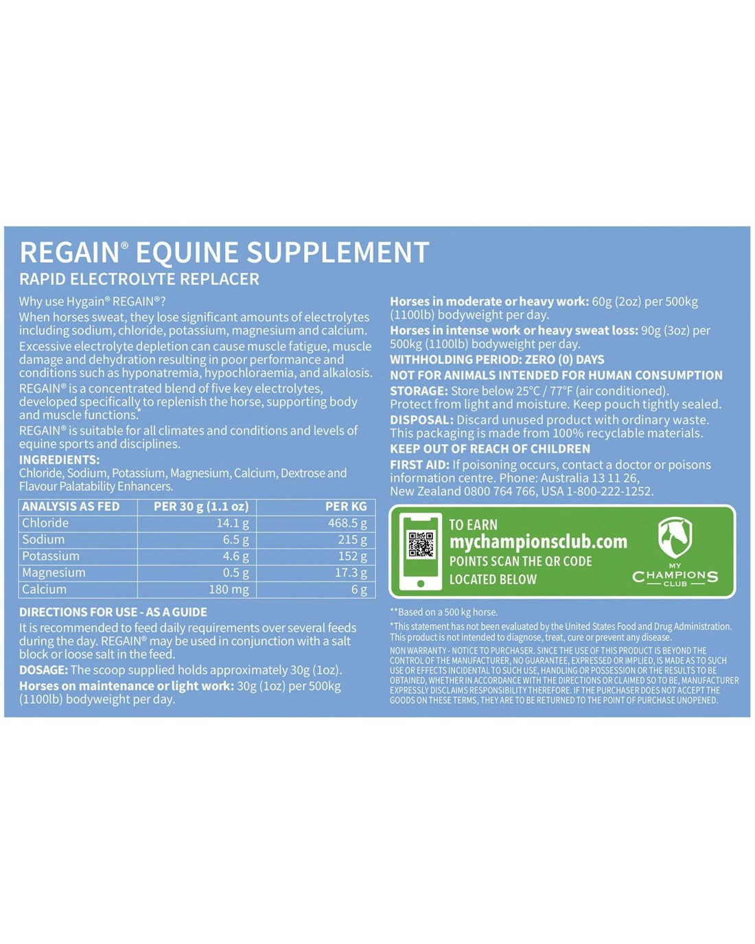 HYGAIN Regain is a rapid electrolyte replacer to restore salts lost in sweat during work and hot weather. Use as directed to support hydration and recovery. 5kg pack.