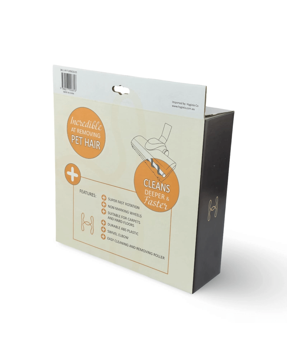 The Hygieia Whirlwind Turbo Head is an advanced vacuum accessory designed for effective deep-cleaning across a variety of floor types. It features an air-driven rotating brush that excels at lifting dust, debris, and pet hair, especially from carpets and rugs. With a 32mm and 35mm compatible adapter, it fits seamlessly with many vacuum models, offering excellent versatility. Its durable ABS plastic construction ensures lasting performance under regular, demanding use. Ideally suited for homes with pets, it requires no additional power source, operating solely through vacuum suction.