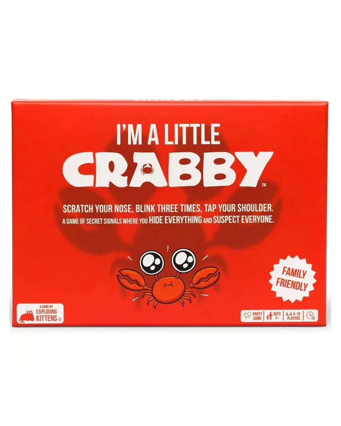 I'm A Little Crabby is a game of secret hand signals, suspicious friends, and hidden identities. Pick a partner and establish a secret signal, then collect a set of four matching cards. Once you get a matching set, try to tell your partner by using your secret signal. Be careful - if your opponents intercept your signal first, you lose a point. Hide everything and suspect everyone in this game of secret signals. Ages: 7+