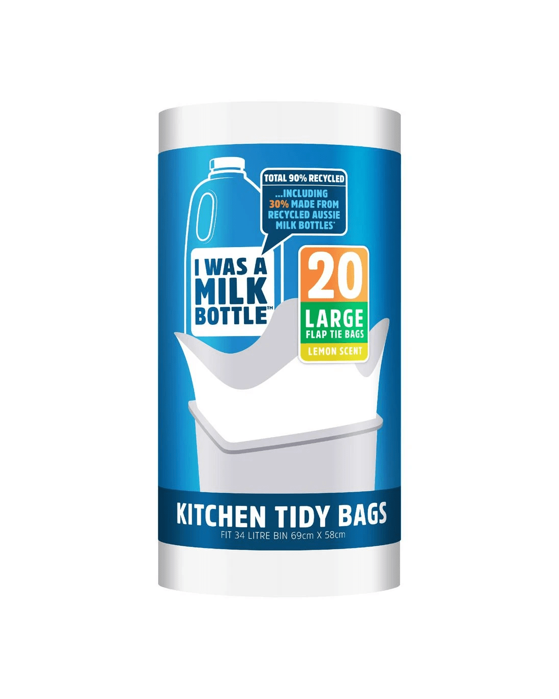 These I Was a Milk Bottle Kitchen Tidy Bags are partly made from Australian milk bottles. They have a strong but simple flap tie closure, and are lemon-scented to cover up unpleasant smells.