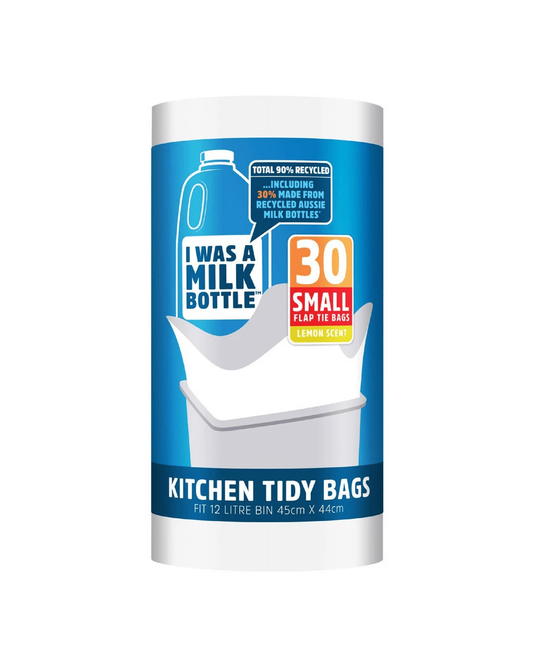 These I Was a Milk Bottle Kitchen Tidy Bags are partly made from Australian milk bottles. They have a strong but simple flap tie closure, and are lemon-scented to cover up unpleasant smells.