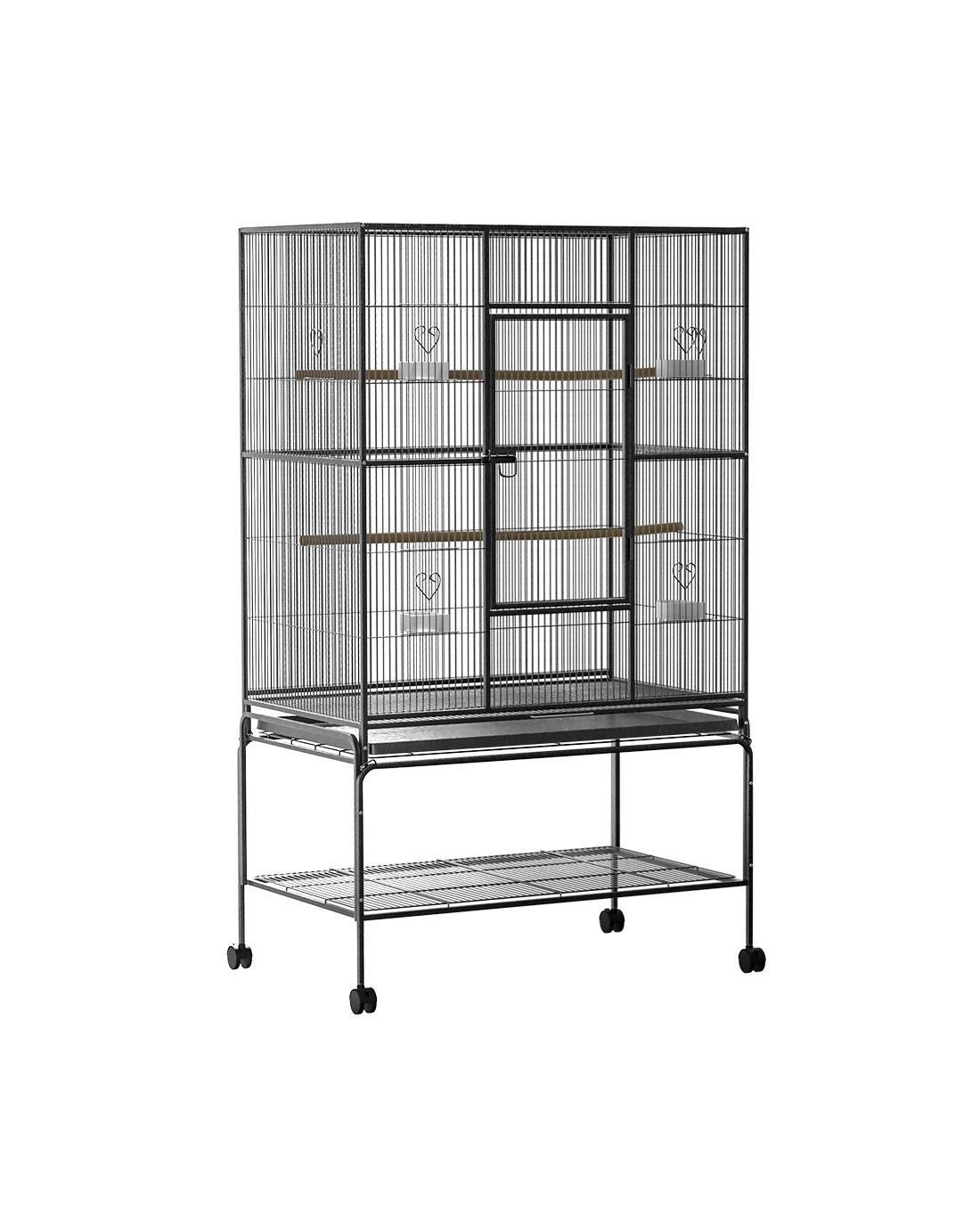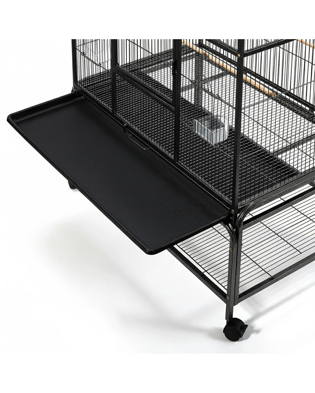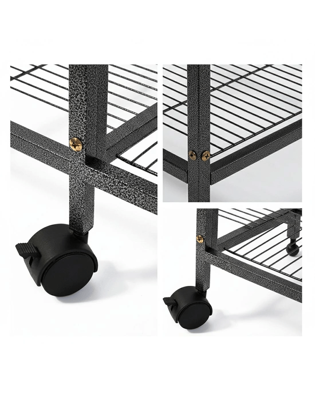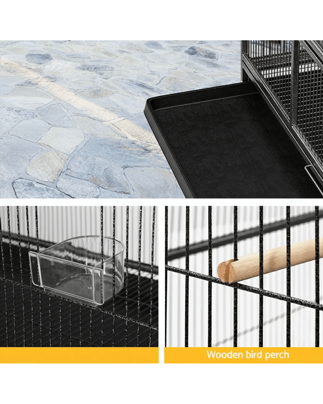 With roomy accommodation for birds of various sizes, the i.Pet Bird Cage is definitely the most comfortable roost for your fine-feathered friends. Made of high quality and durable wrought iron with a non-toxic powder-coated finish, the cage comes with a large access door with secured locks, two small food access windows, two timber perches, four food and water bowls and a removable slide-out tray for easy clean up. Better still, the palatial cage is set on a sturdy stand that features a bottom shelf for extra storage space and strong legs with castor wheels attached for easy mobility.